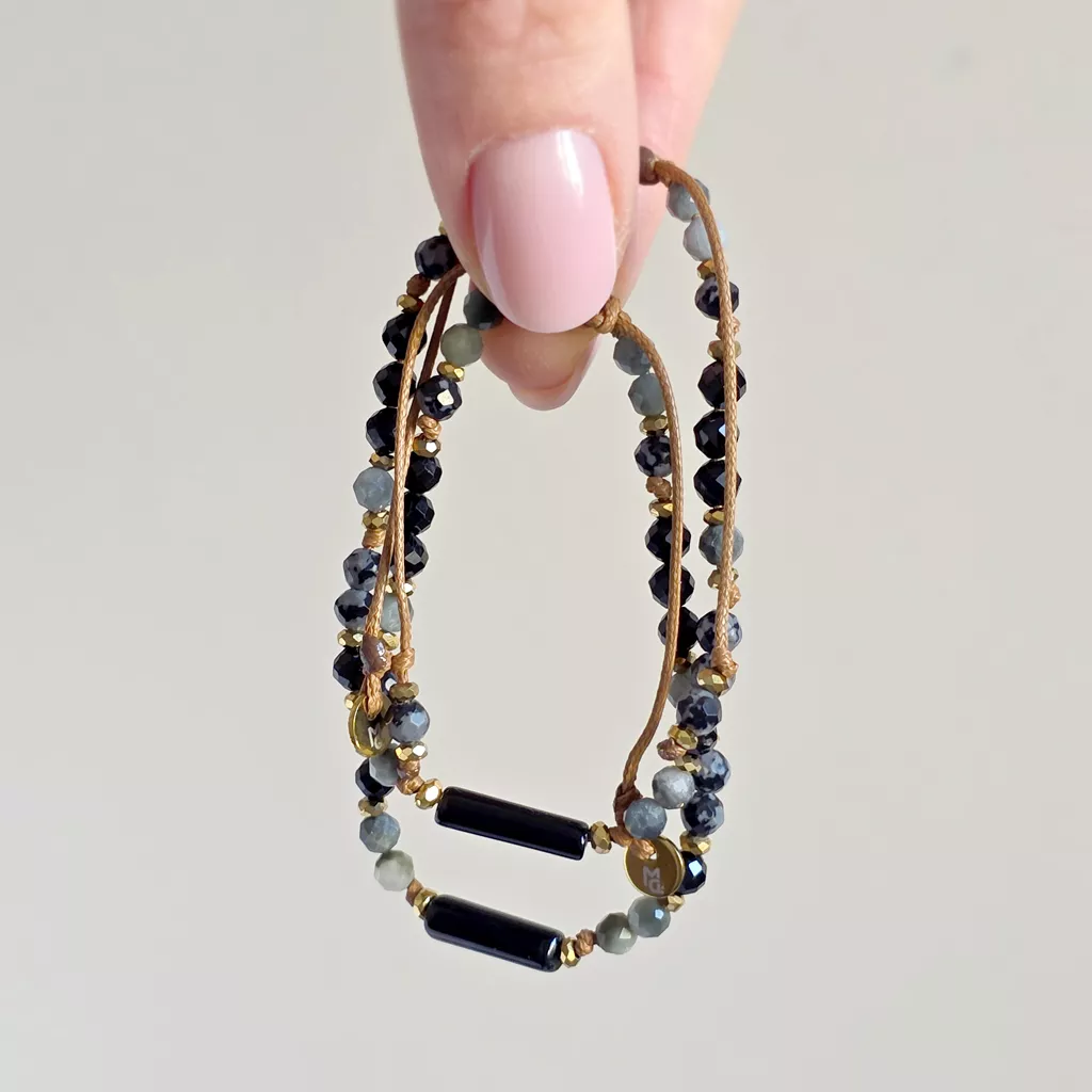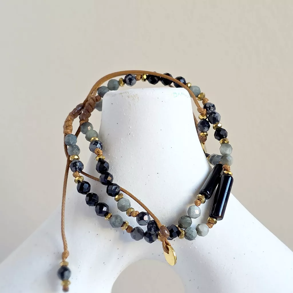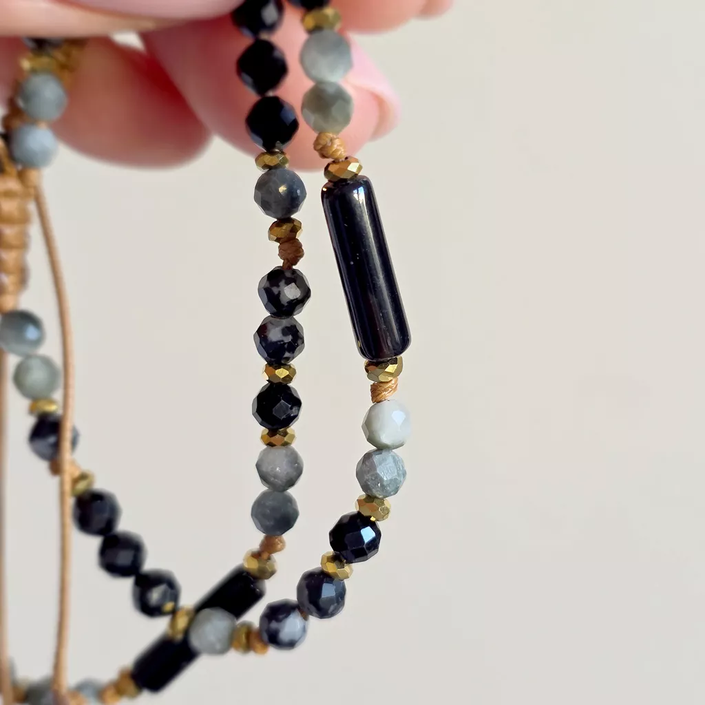 Bransoletka Fullness of Inner Guardian to mocna, ochronna kompozycja naturalnych kamieni stworzona dla osób, które chcą czuć stabilność, bezpieczeństwo i wewnętrzną siłę. Połączenie czarnego onyksu, orlego oka, obsydianu śnieżnego, czarnego turmalinu i hematytu tworzy energetyczną tarczę – spokojną, ale bardzo wyraźną.