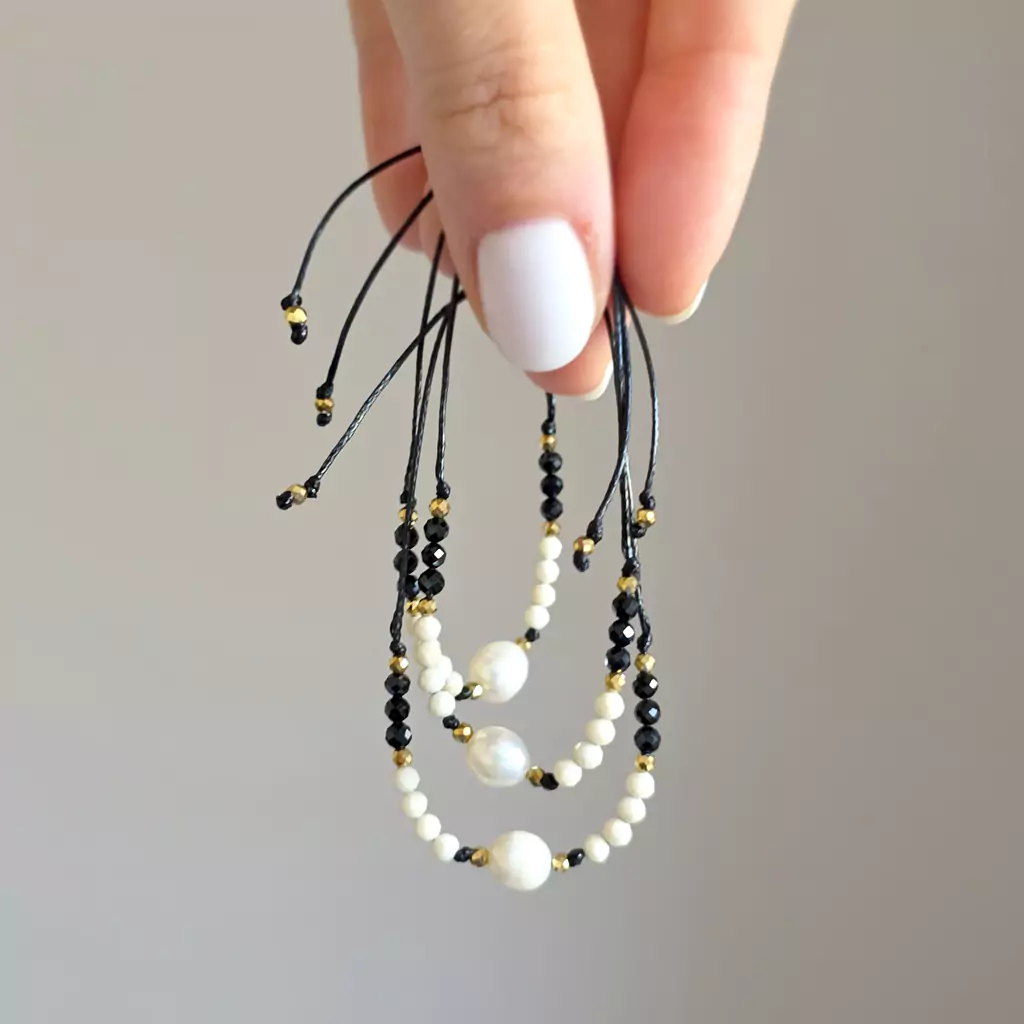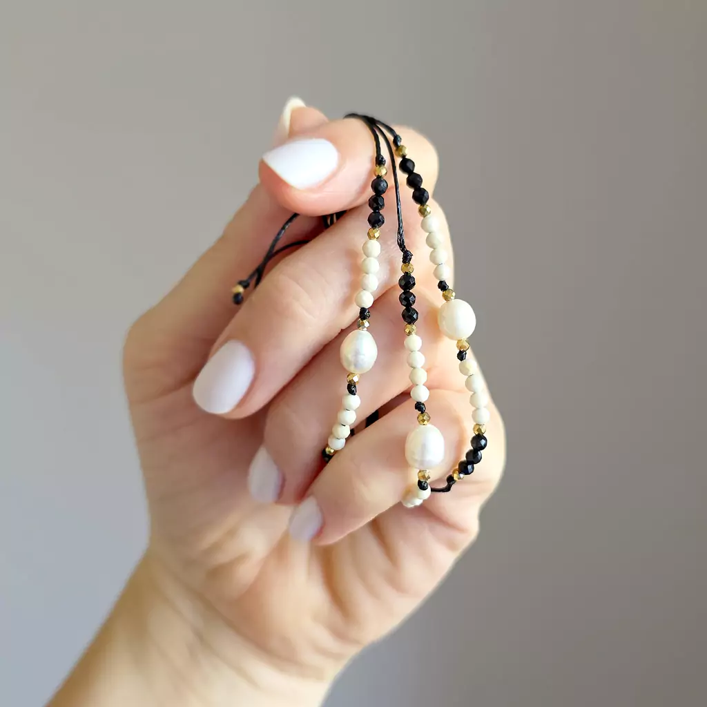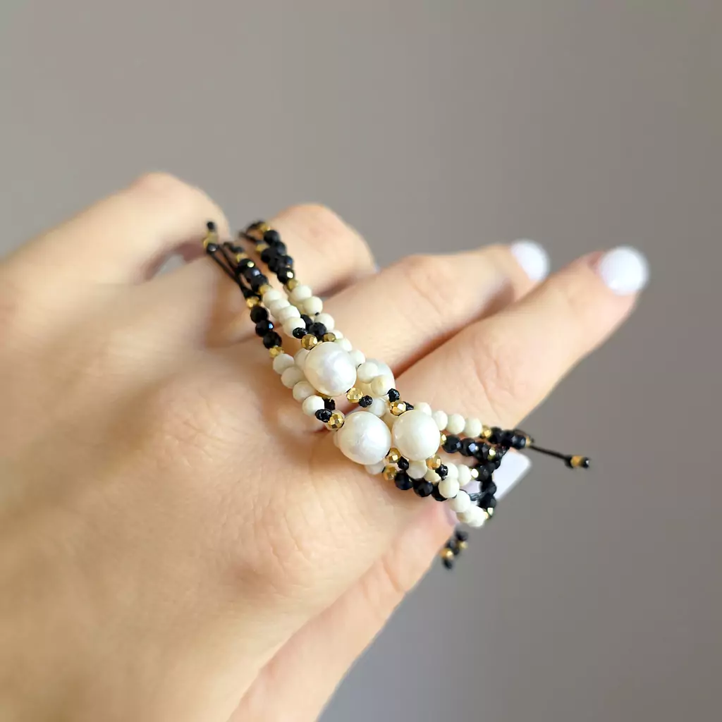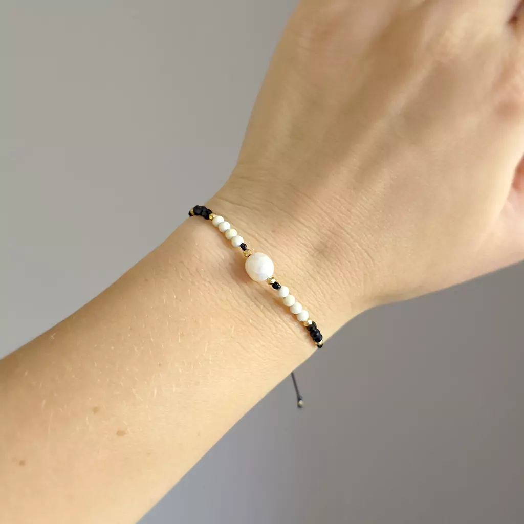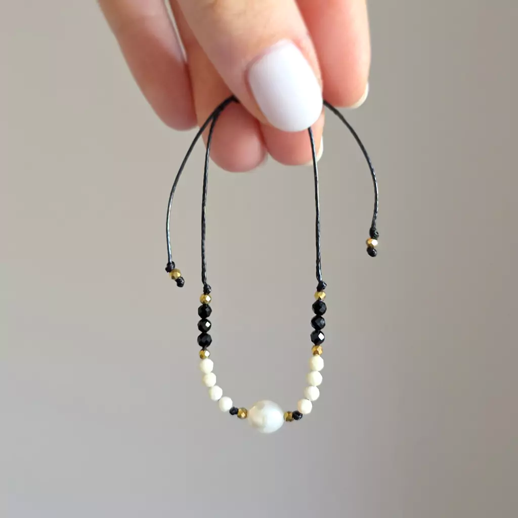 Bransoletka wykonana z perły słodkowodnej i kamieni naturalnych - kamienia rzecznego, czarnego turmalinu i hematytu oraz nylonowego sznureczka.