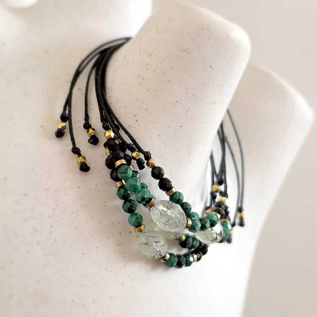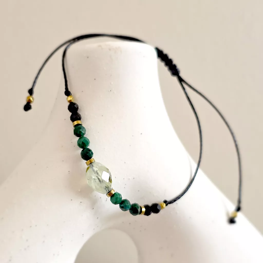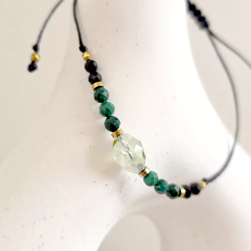 Bransoletka wykonana z kamieni naturalnych - prehnitu z epidotem, malachitu, czarnego turmalinu i hematytu - silnych kamieni ochronnych oraz nylonowego sznureczka.