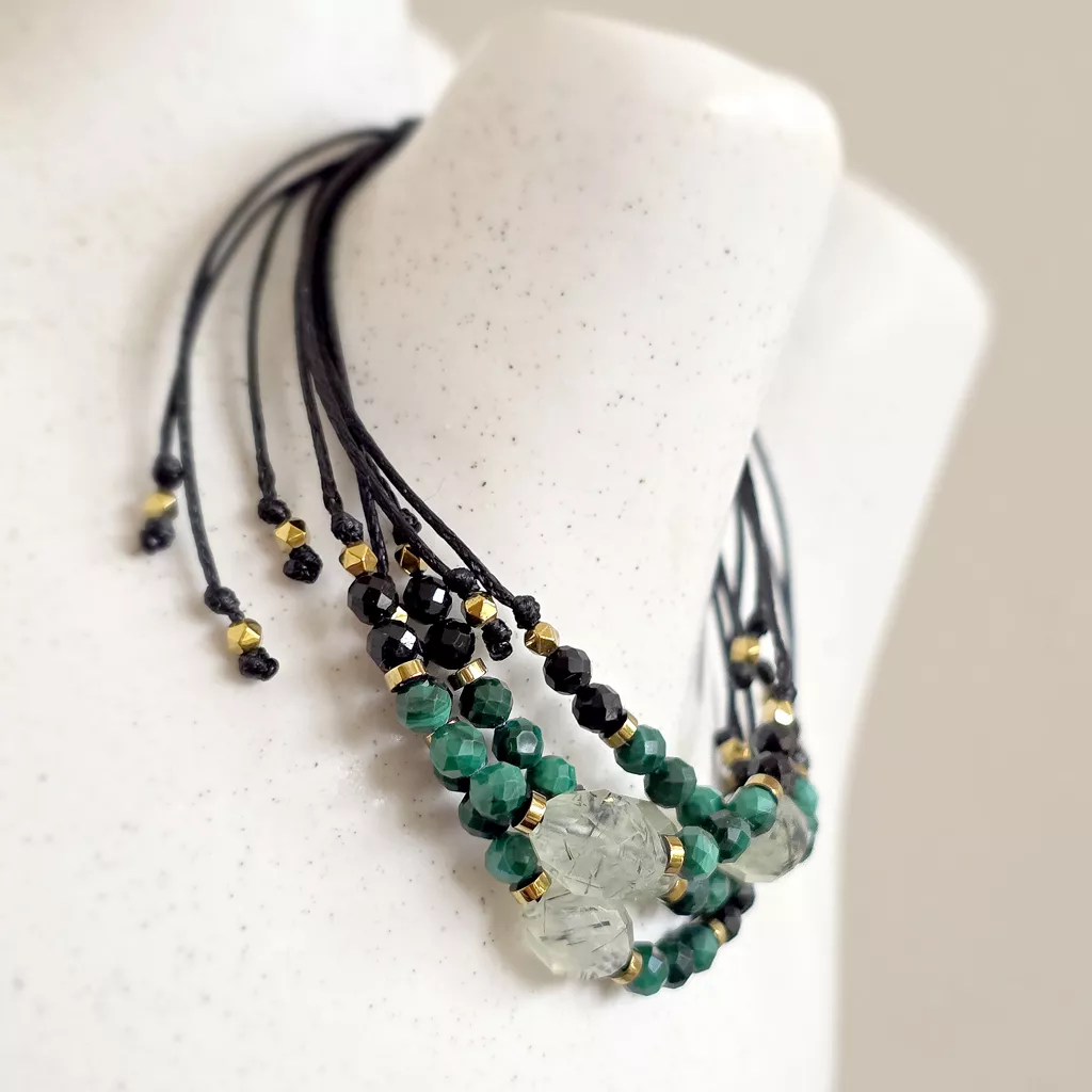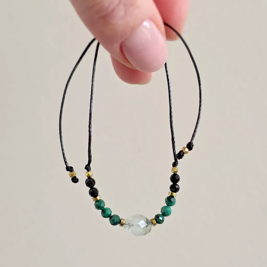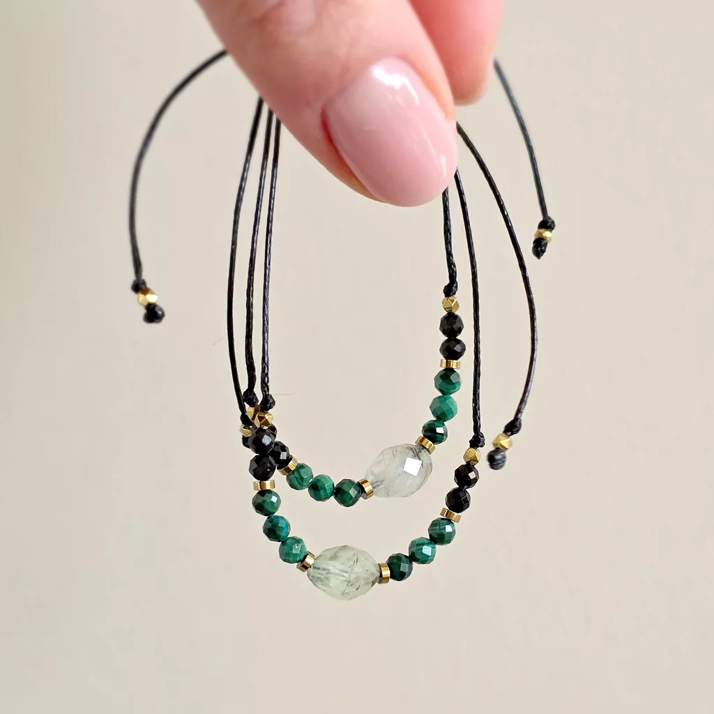 Bransoletka wykonana z kamieni naturalnych - prehnitu z epidotem, malachitu, czarnego turmalinu i hematytu - silnych kamieni ochronnych oraz nylonowego sznureczka.