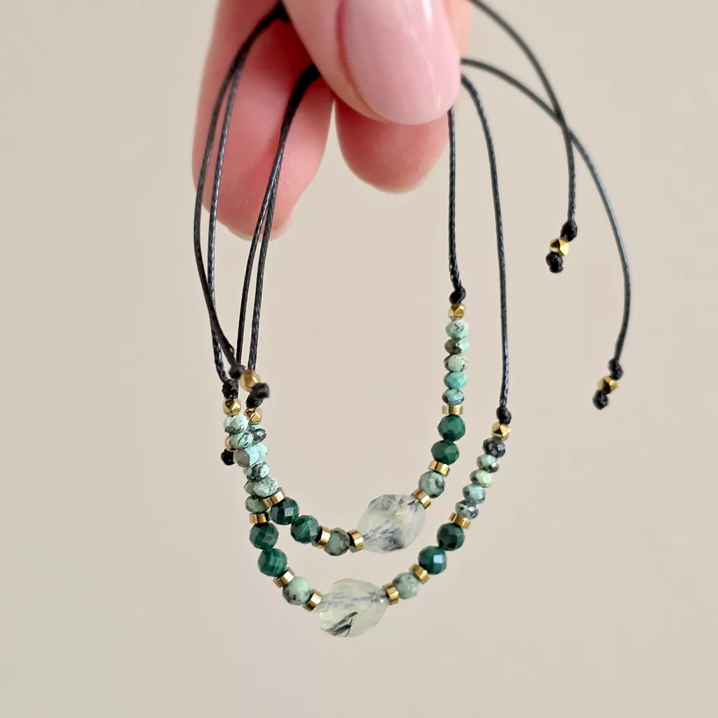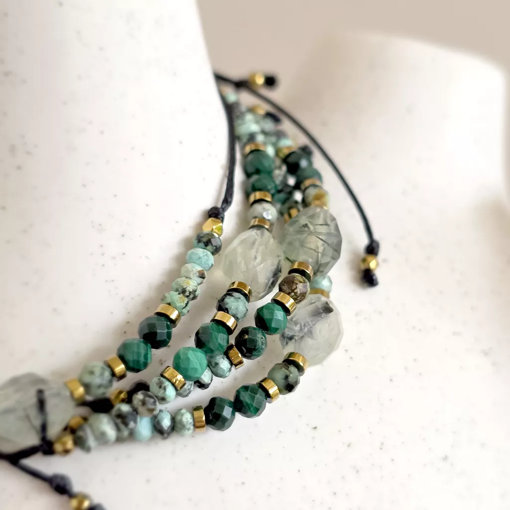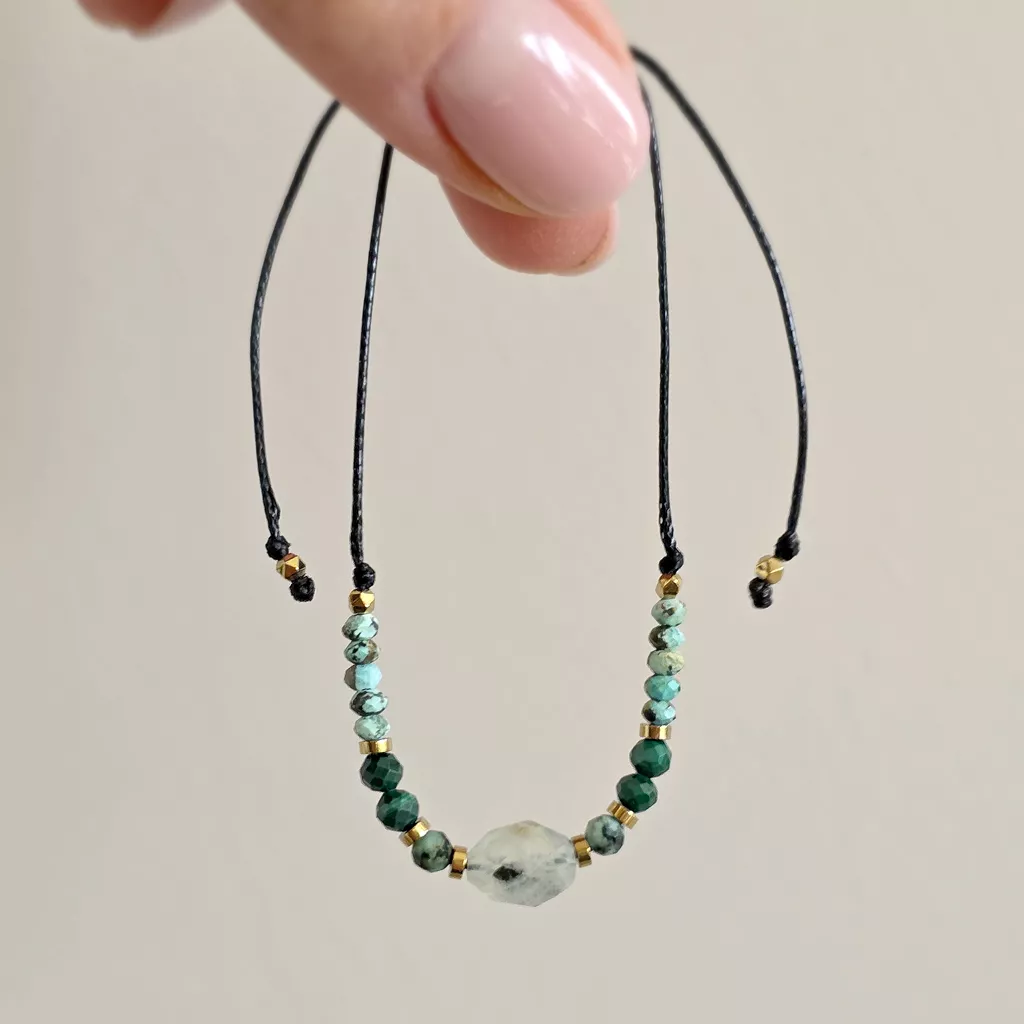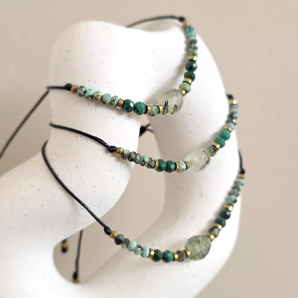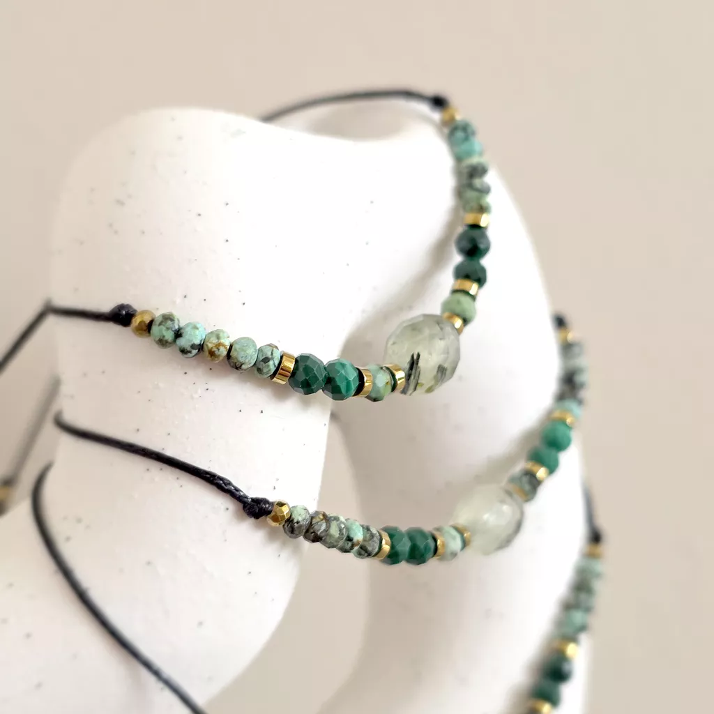 Bransoletka wykonana z kamieni naturalnych - prehnitu z epidotem, turkusu, malachitu i hematytu oraz nylonowego sznureczka.
