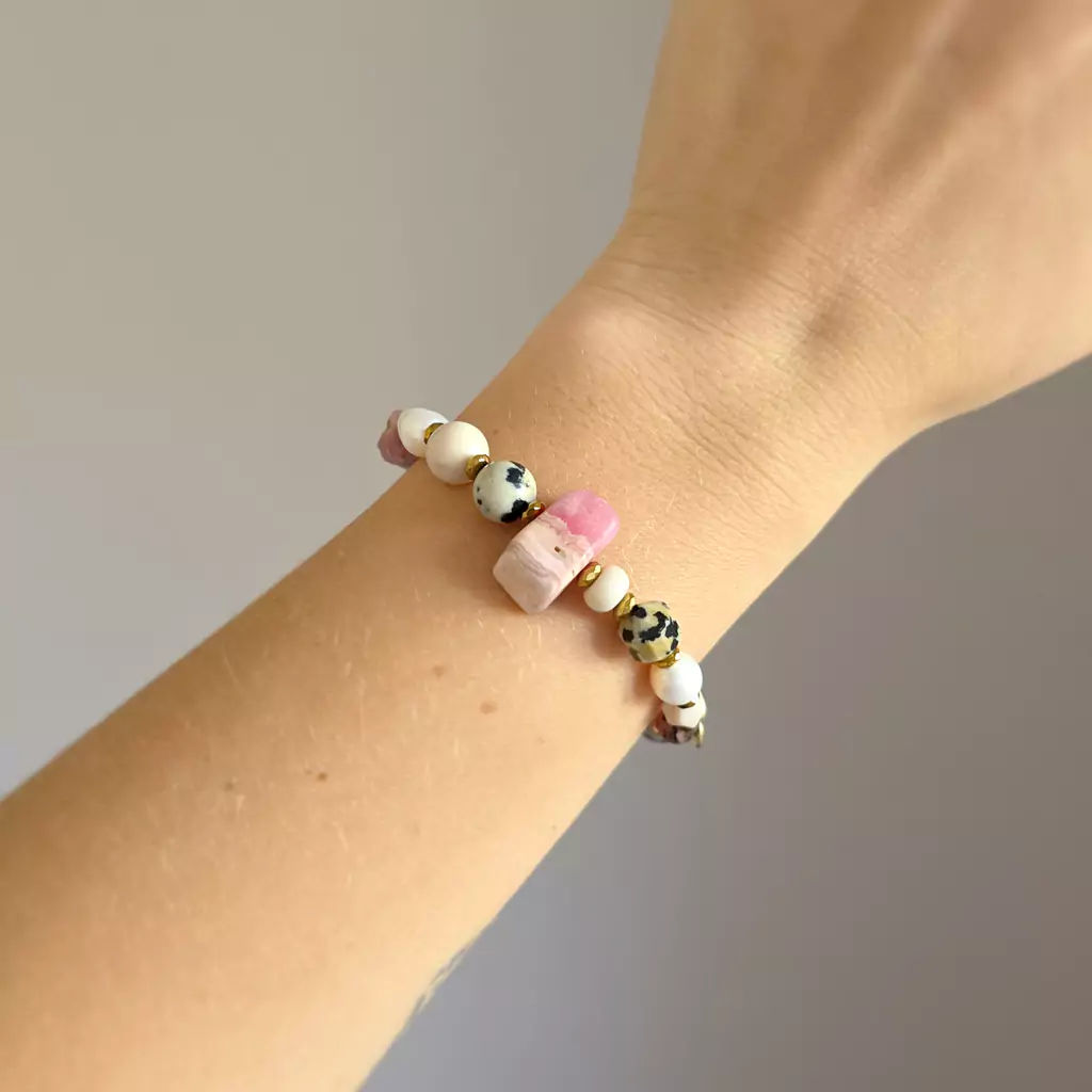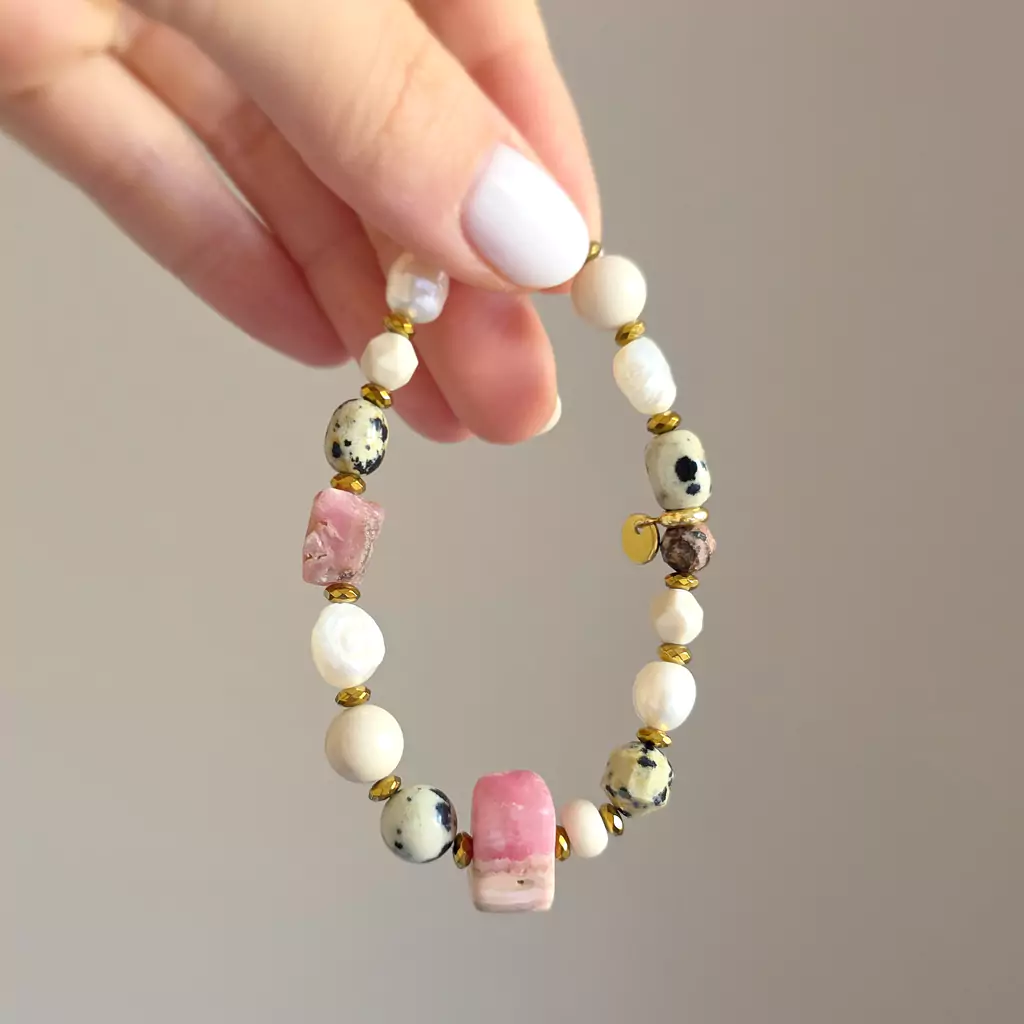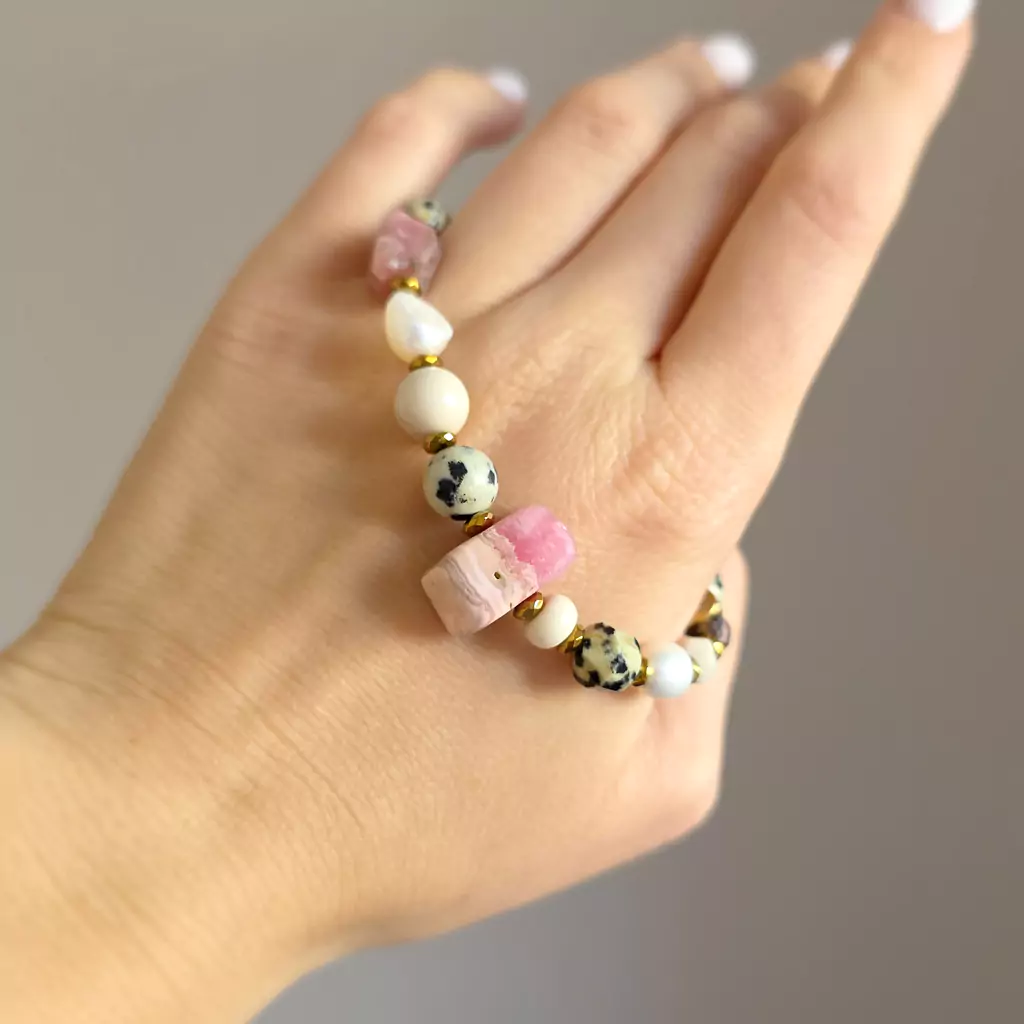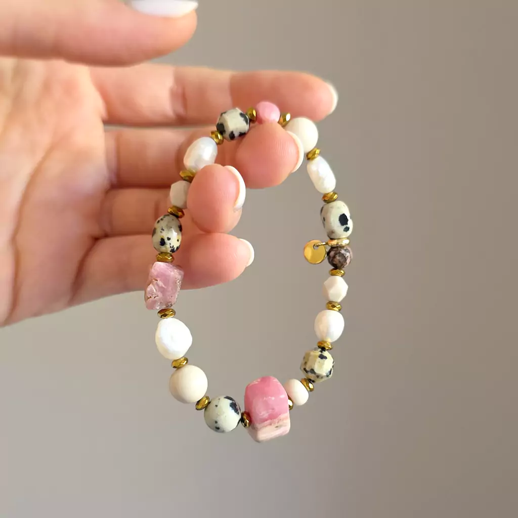 Bransoletka wykonana z pereł słodkowodnych i kamieni naturalnych - rodochrozytu, kamienia rzecznego, jaspisu dalmatyńczyka i hematytu oraz elementów metalowych z pozłacanej stali chirurgicznej.