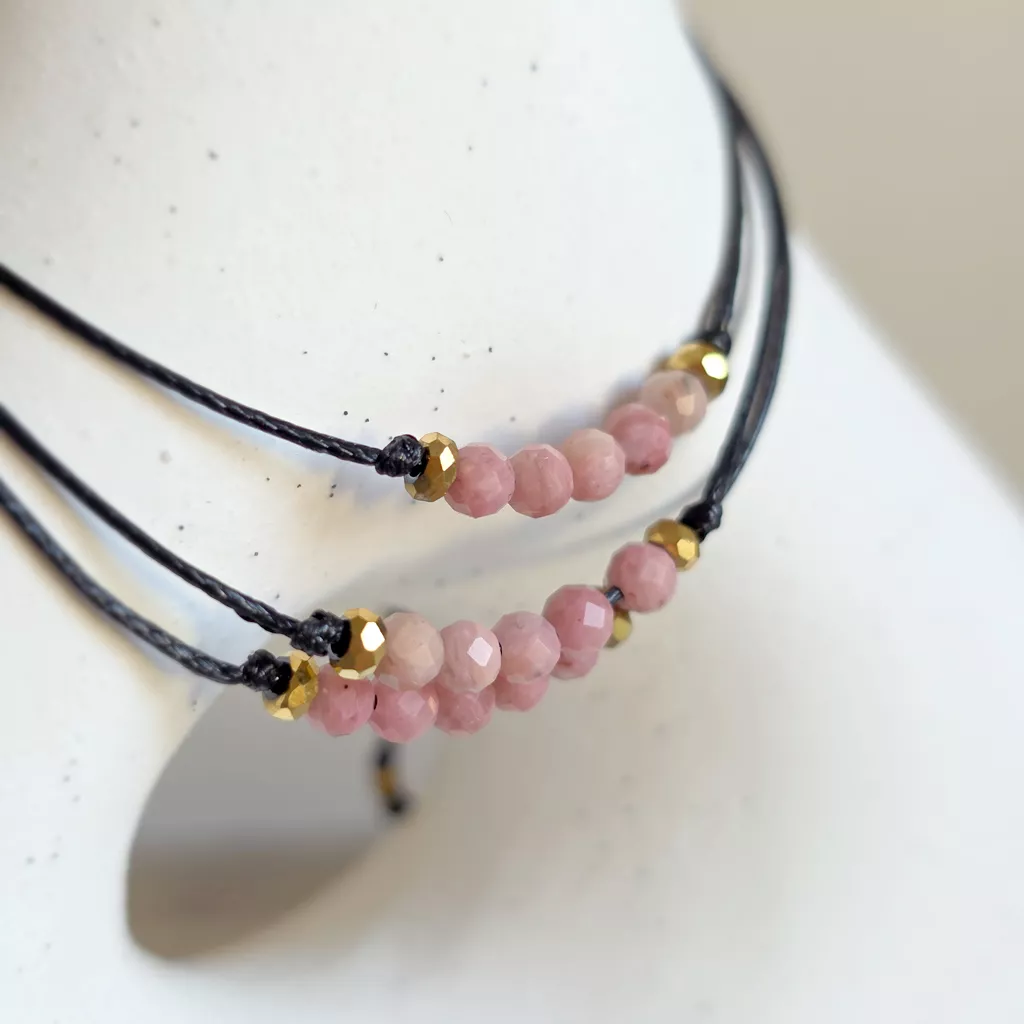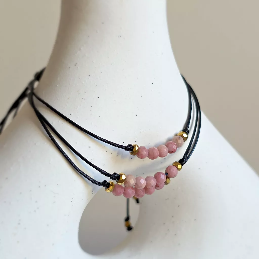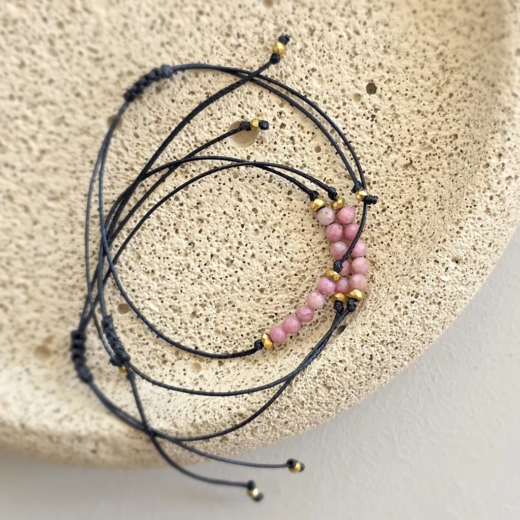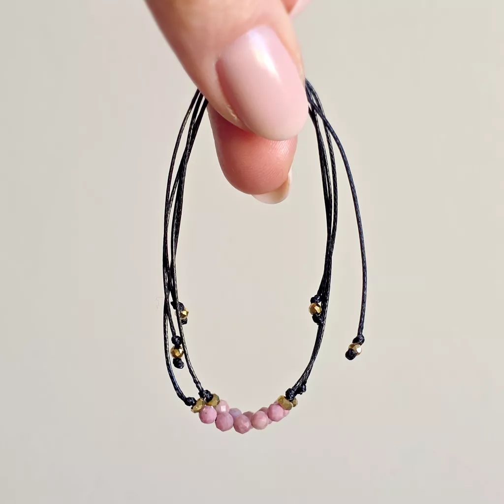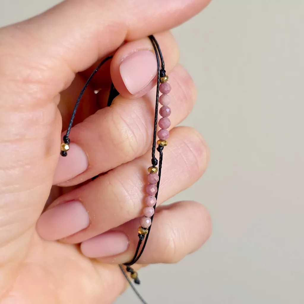 Subtelna, minimalistyczna bransoletka z rodonitu i złotego hematytu to delikatny akcent, który łączy miękkość serca z eleganckim wykończeniem. Składa się z 5 drobnych kuleczek rodonitu (ok. 3,5 mm) oraz złotych hematytów, dzięki czemu jest lekka, dyskretna i idealna do codziennego noszenia.