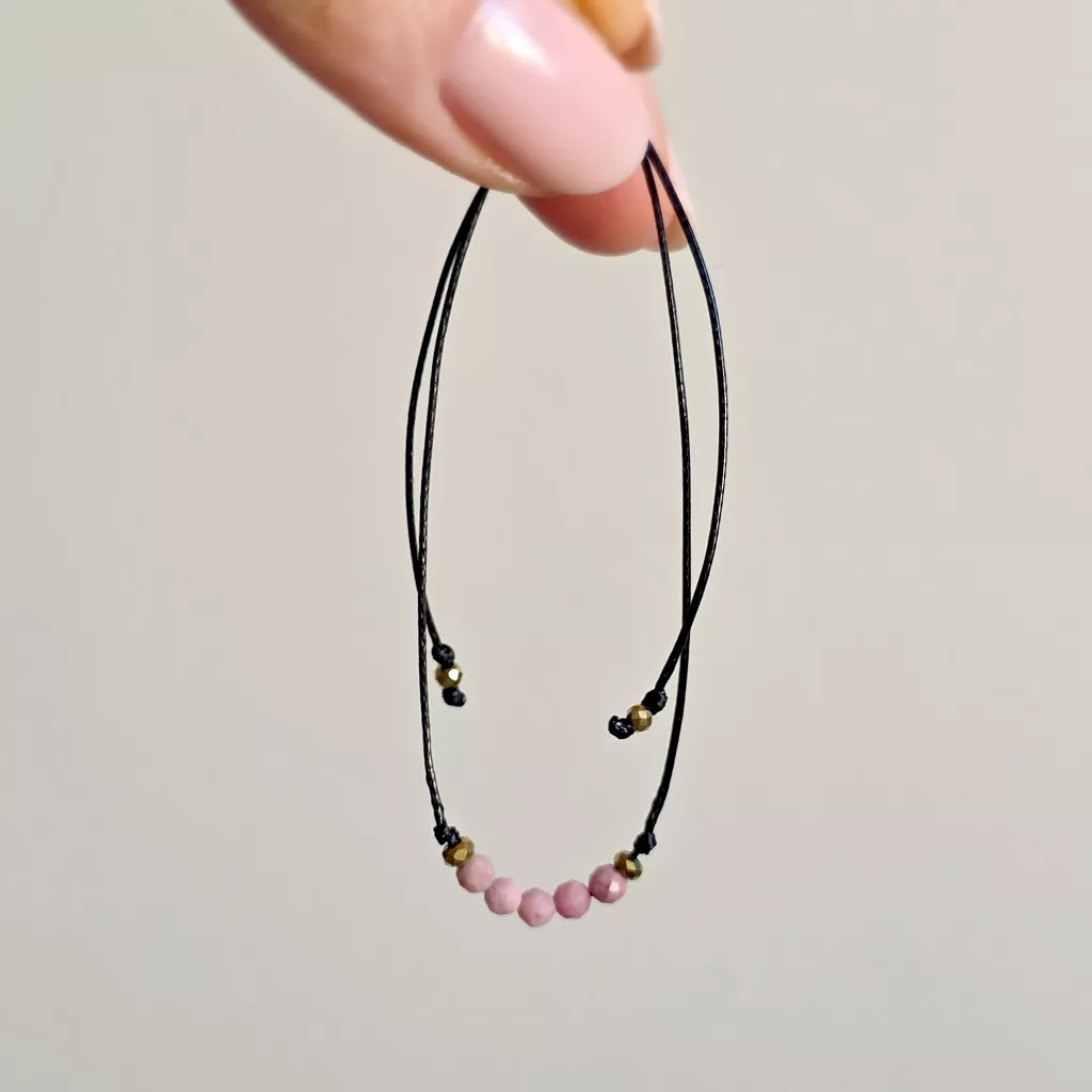 Osadzona na czarnym sznurku, tworzy piękny kontrast pomiędzy różowo-grafitową strukturą kamienia a głęboką czernią. To biżuteria dla osób, które kochają minimalizm, ale chcą jednocześnie czuć energię kamieni – subtelnie, ale świadomie.