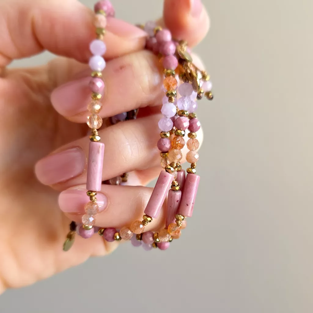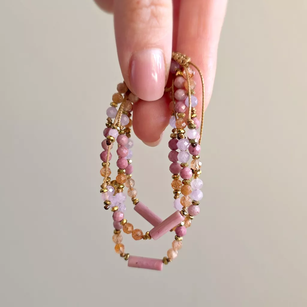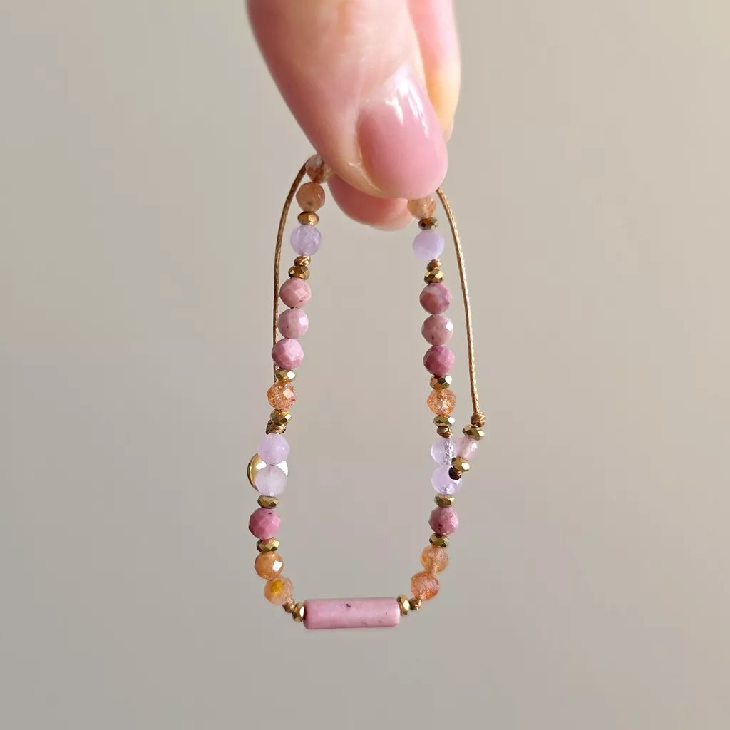 Fullness of joyful heart to bransoletka, która łączy radość z czułością. Rodonit pomaga uzdrawiać emocje i wzmacnia miłość własną. Kamień słoneczny wnosi lekkość, optymizm i energię życia, rozświetlając serce od środka. Kunzyt otula delikatnością, uczy łagodności wobec siebie i innych. Hematyt stabilizuje emocje i daje poczucie bezpieczeństwa. To talizman dla kobiet, które chcą żyć z otwartym sercem – radośnie, świadomie i w zgodzie ze sobą.