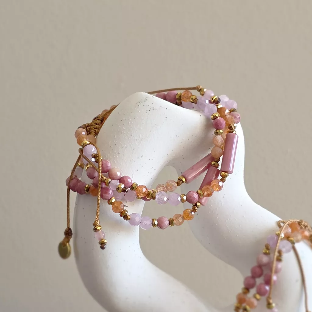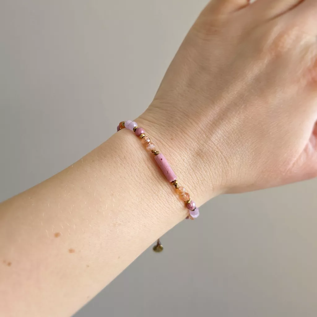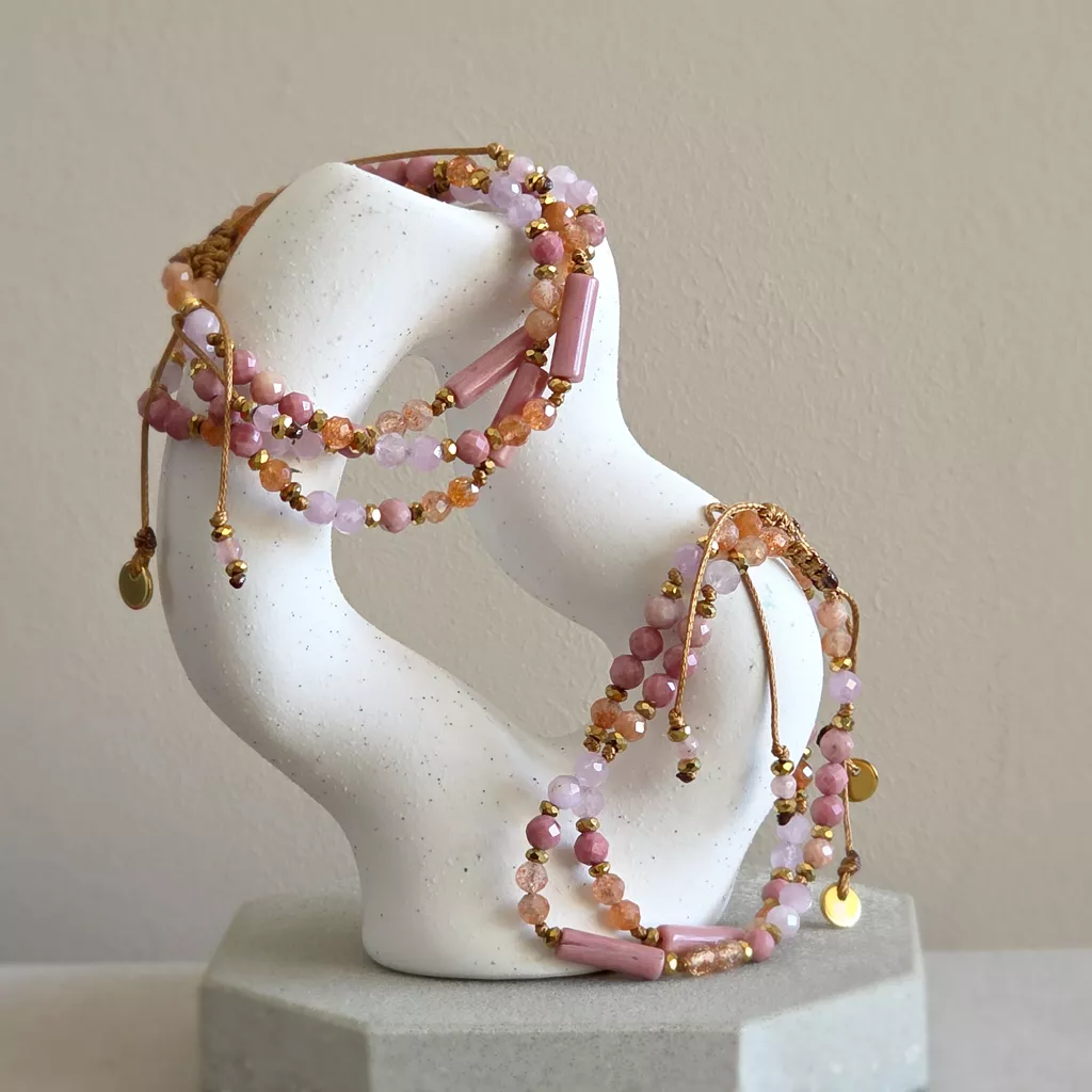 Fullness of joyful heart to bransoletka, która łączy radość z czułością. Rodonit pomaga uzdrawiać emocje i wzmacnia miłość własną. Kamień słoneczny wnosi lekkość, optymizm i energię życia, rozświetlając serce od środka. Kunzyt otula delikatnością, uczy łagodności wobec siebie i innych. Hematyt stabilizuje emocje i daje poczucie bezpieczeństwa. To talizman dla kobiet, które chcą żyć z otwartym sercem – radośnie, świadomie i w zgodzie ze sobą.