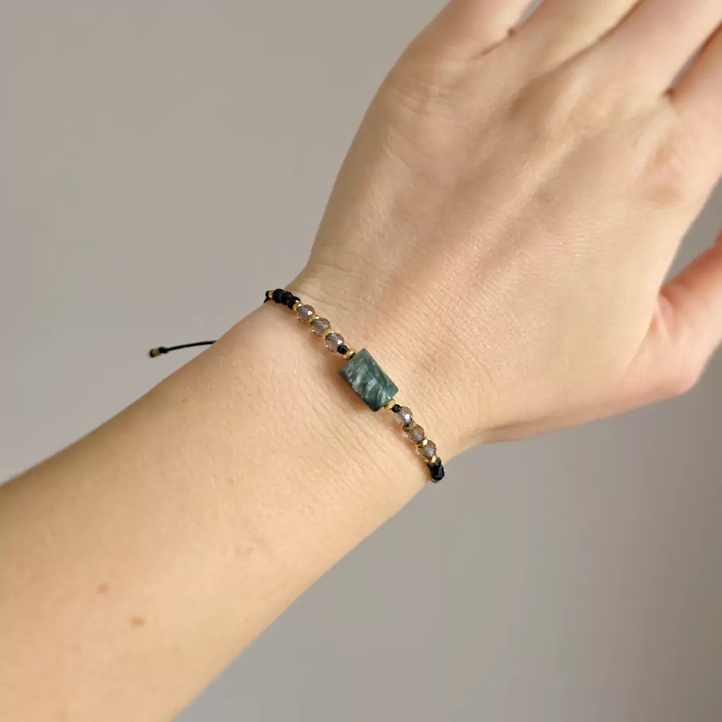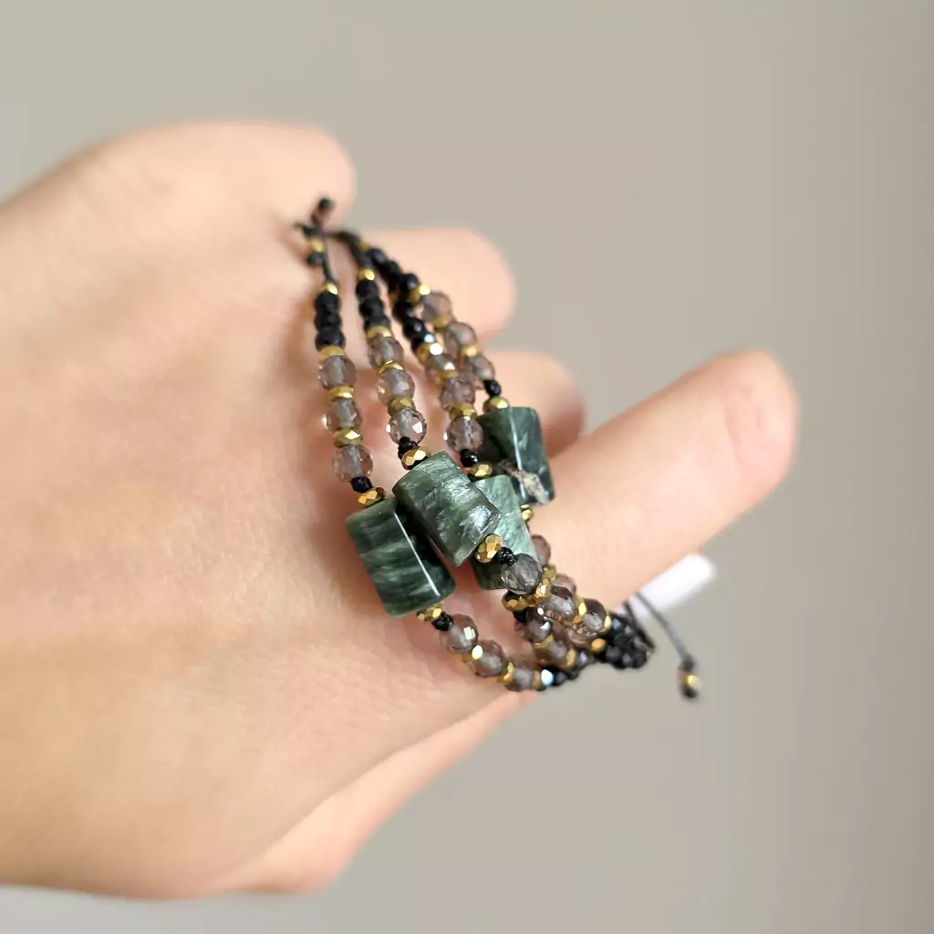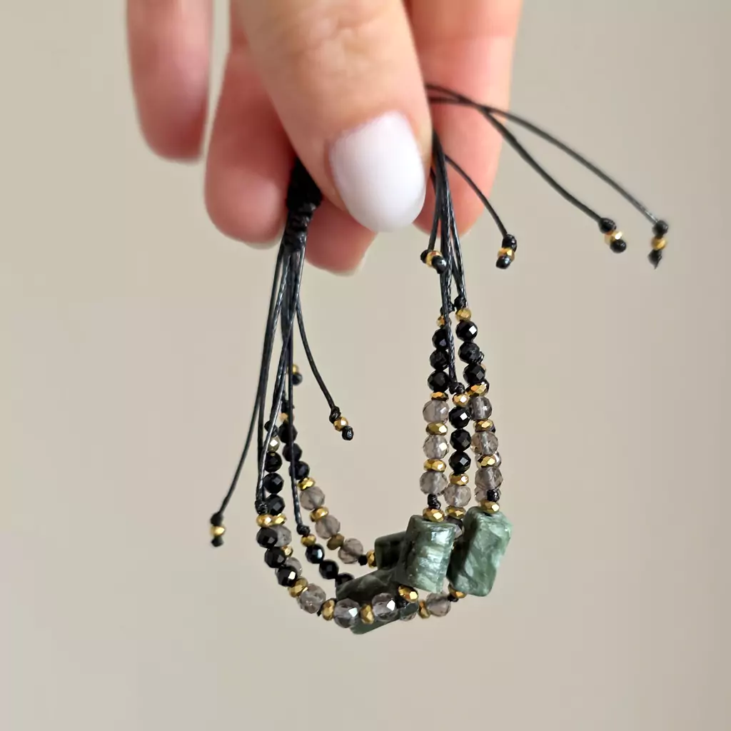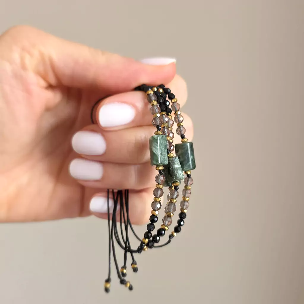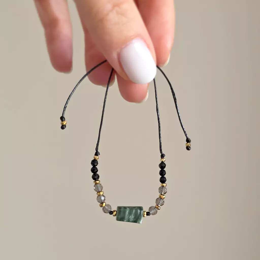 Bransoletka wykonana z kamieni naturalnych - serafinitu, kwarcu dymnego, czarnego turmalinu i hematytu oraz nylonowego sznureczka.