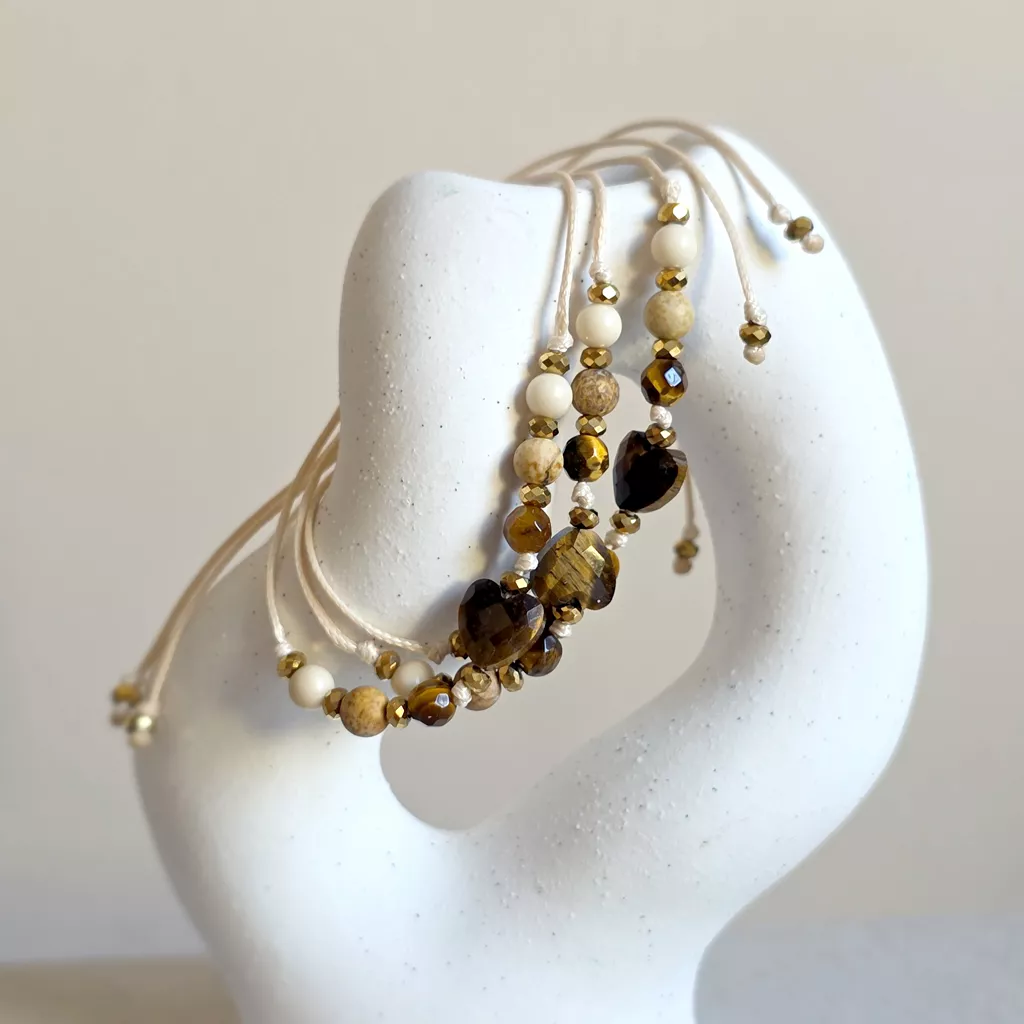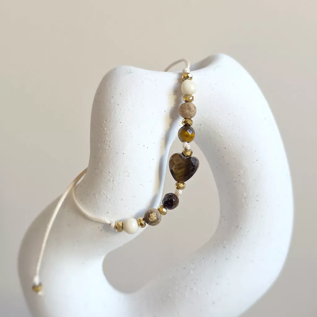 Centralnym akcentem jest tygrysie oko w kształcie serca – symbol bliskości, relacji i czułości. W tej kompozycji łączy się z energią stabilności i siły, tworząc balans pomiędzy sercem a ugruntowaniem.