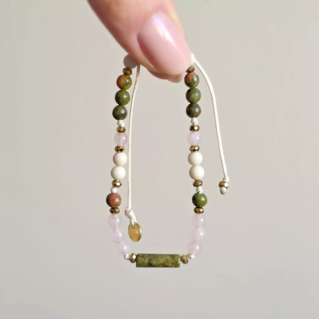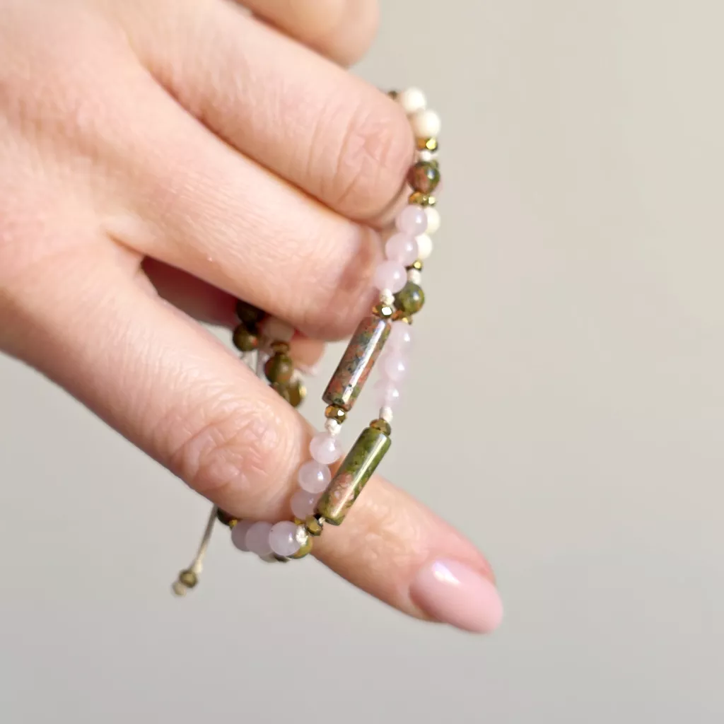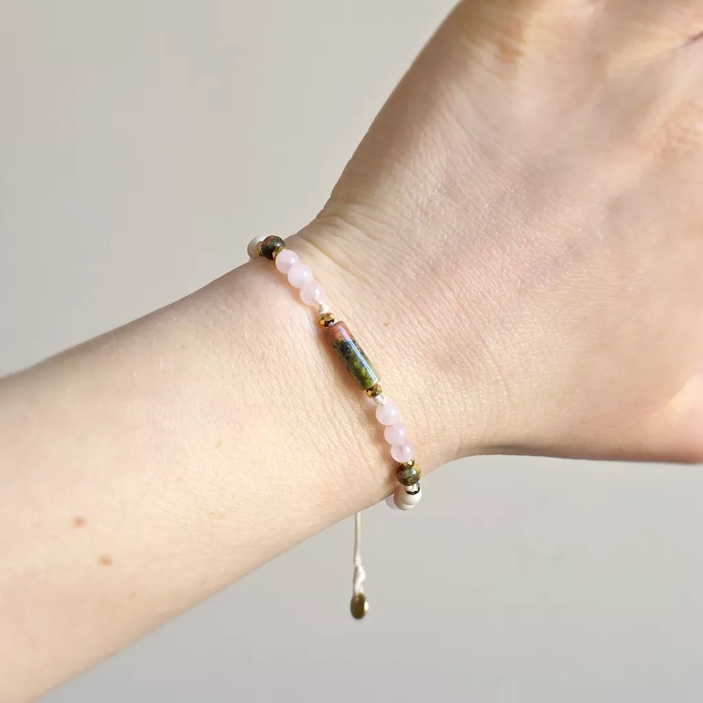 Bransoletka Fullness of Understanding to delikatna, ale głęboka kompozycja naturalnych kamieni, która wspiera zrozumienie siebie, emocji i relacji. Połączenie unakitu, kwarcu różowego, kamienia rzecznego i hematytu tworzy spokojną, harmonijną energię – miękką, ale jednocześnie stabilną.