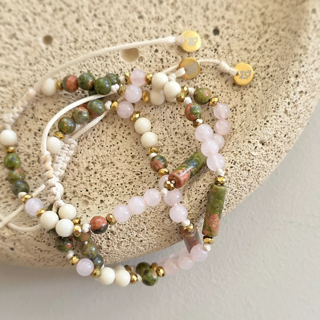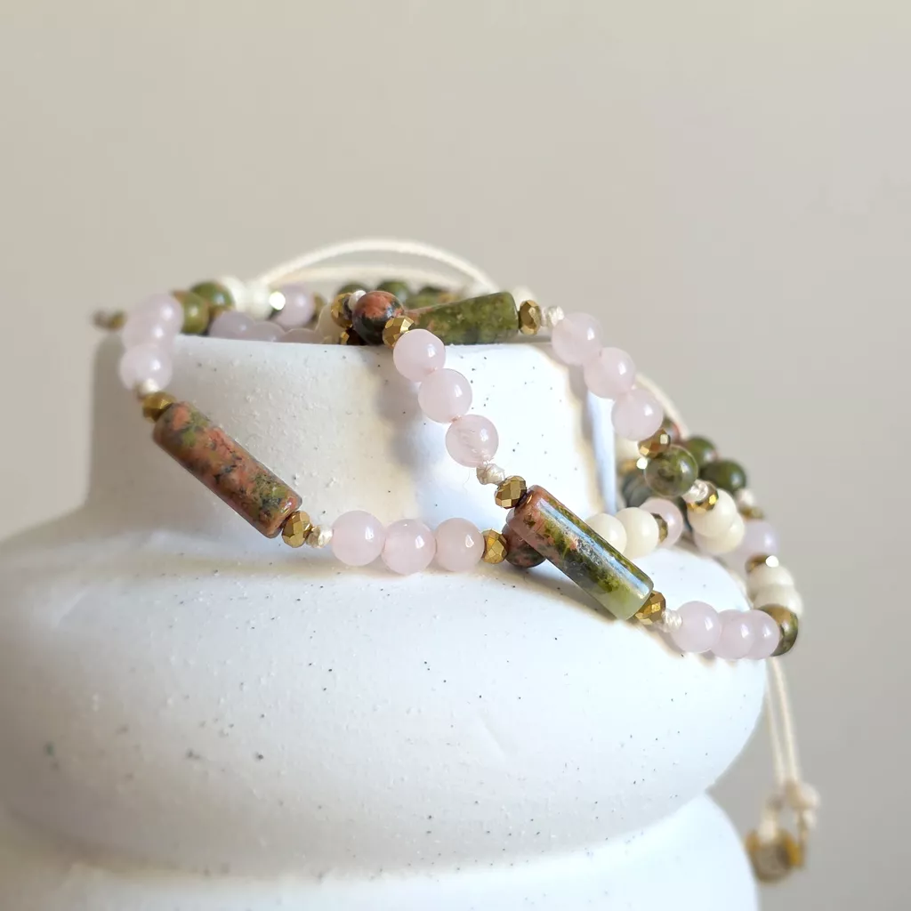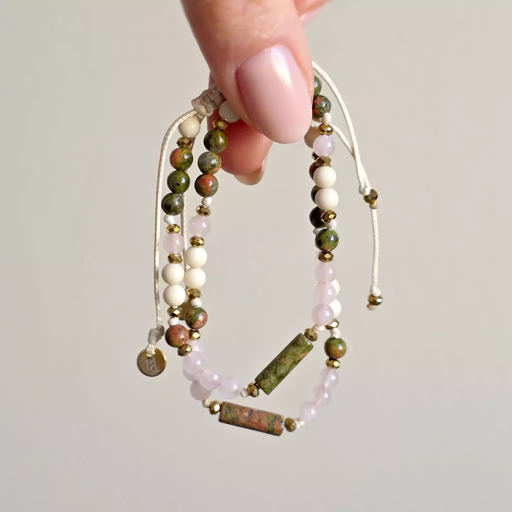 Bransoletka Fullness of Understanding to delikatna, ale głęboka kompozycja naturalnych kamieni, która wspiera zrozumienie siebie, emocji i relacji. Połączenie unakitu, kwarcu różowego, kamienia rzecznego i hematytu tworzy spokojną, harmonijną energię – miękką, ale jednocześnie stabilną.