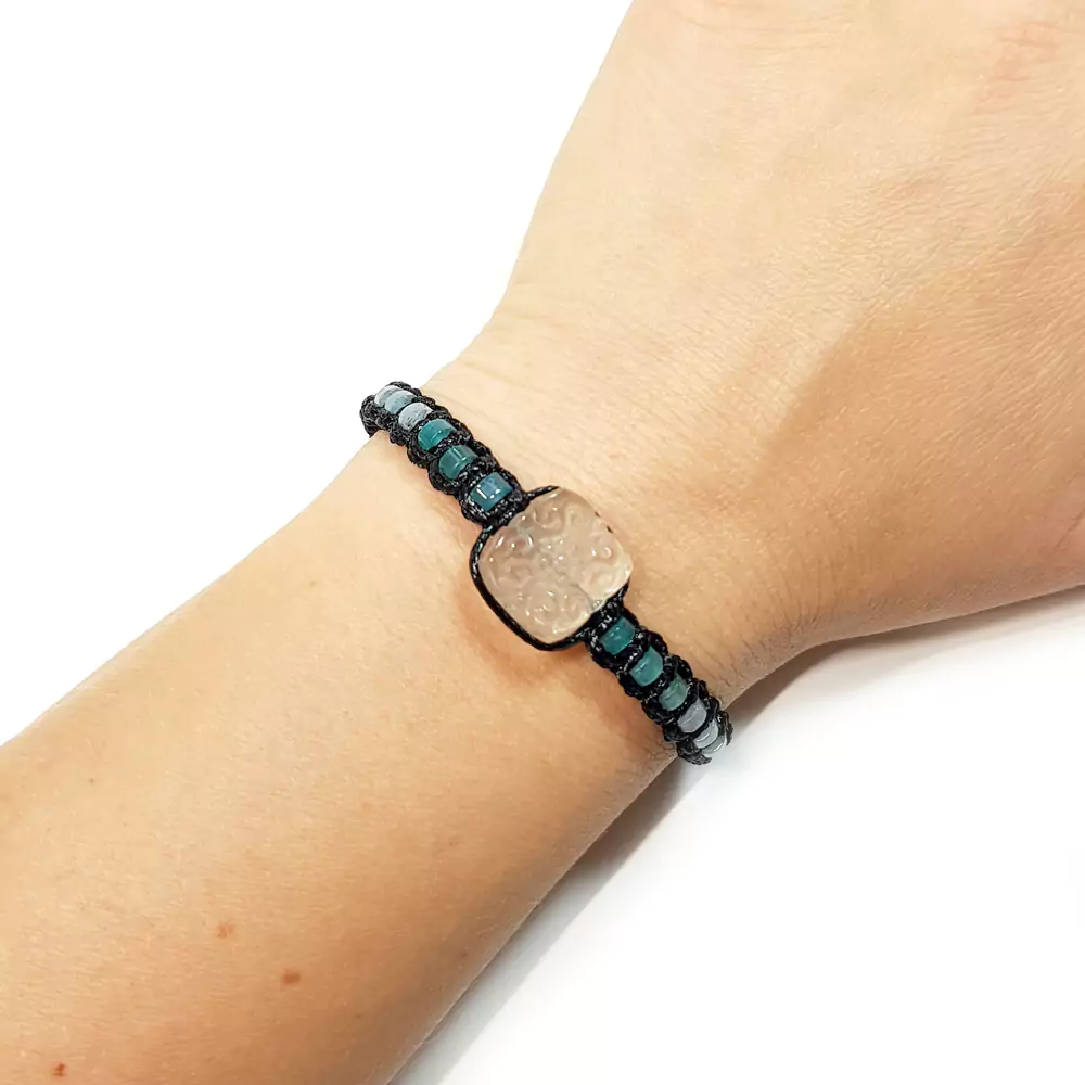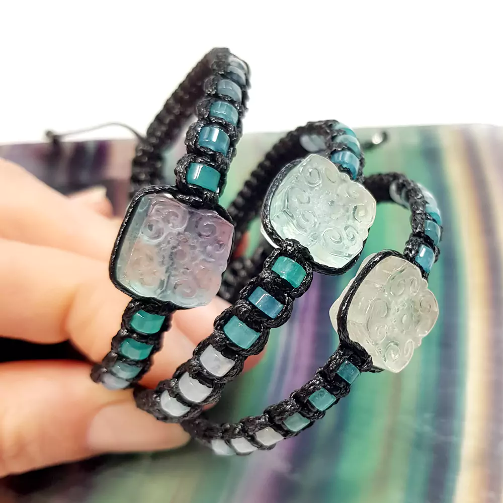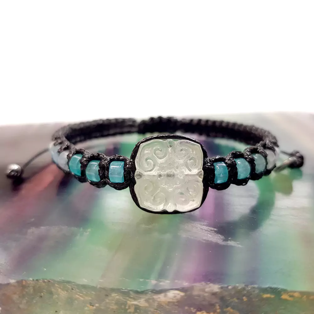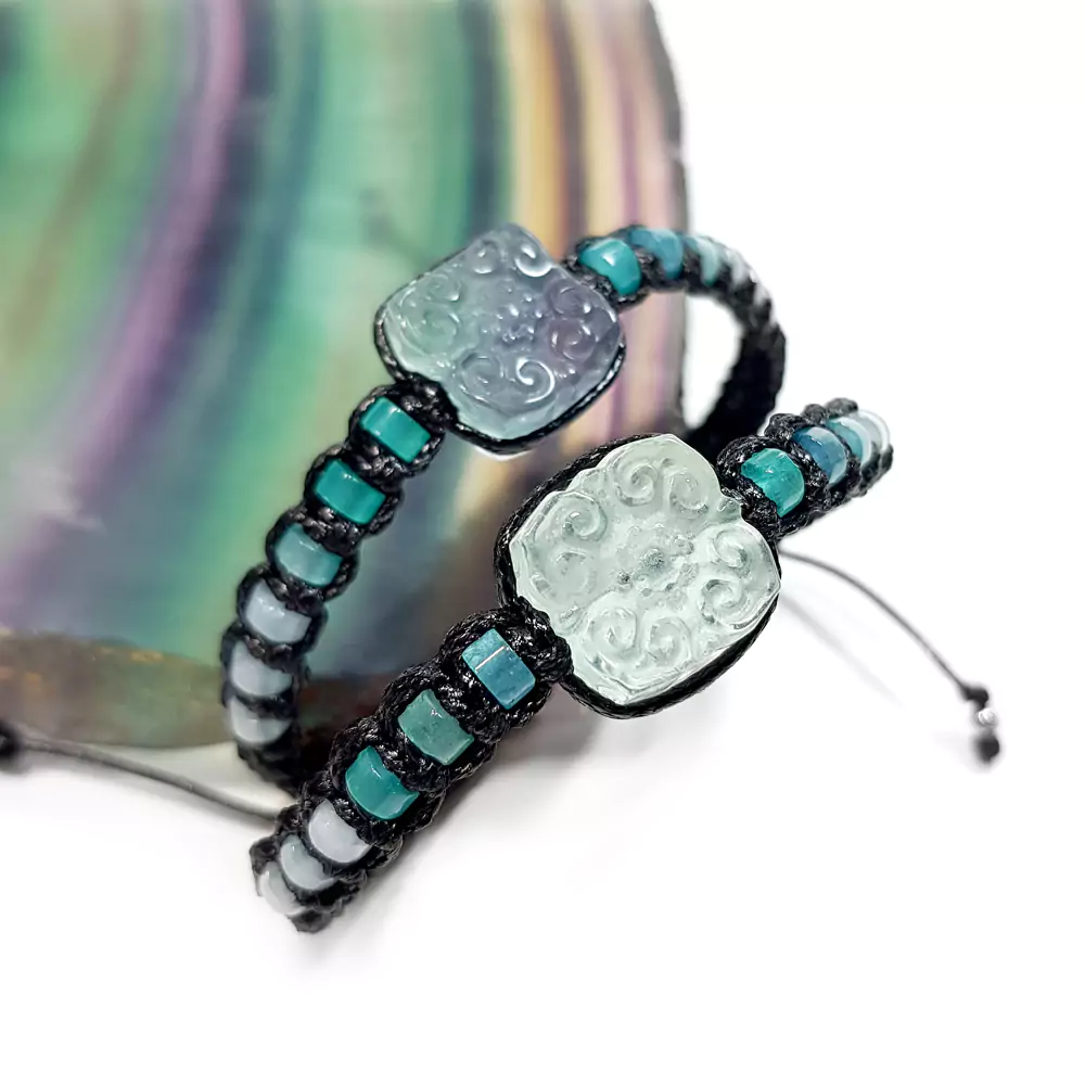 Bransoletka została wykonana z rzeźbionego fluorytu oraz talarków fluorytu i akwamaryu. Podstawę stanowi mocny, nylonowy sznurek.