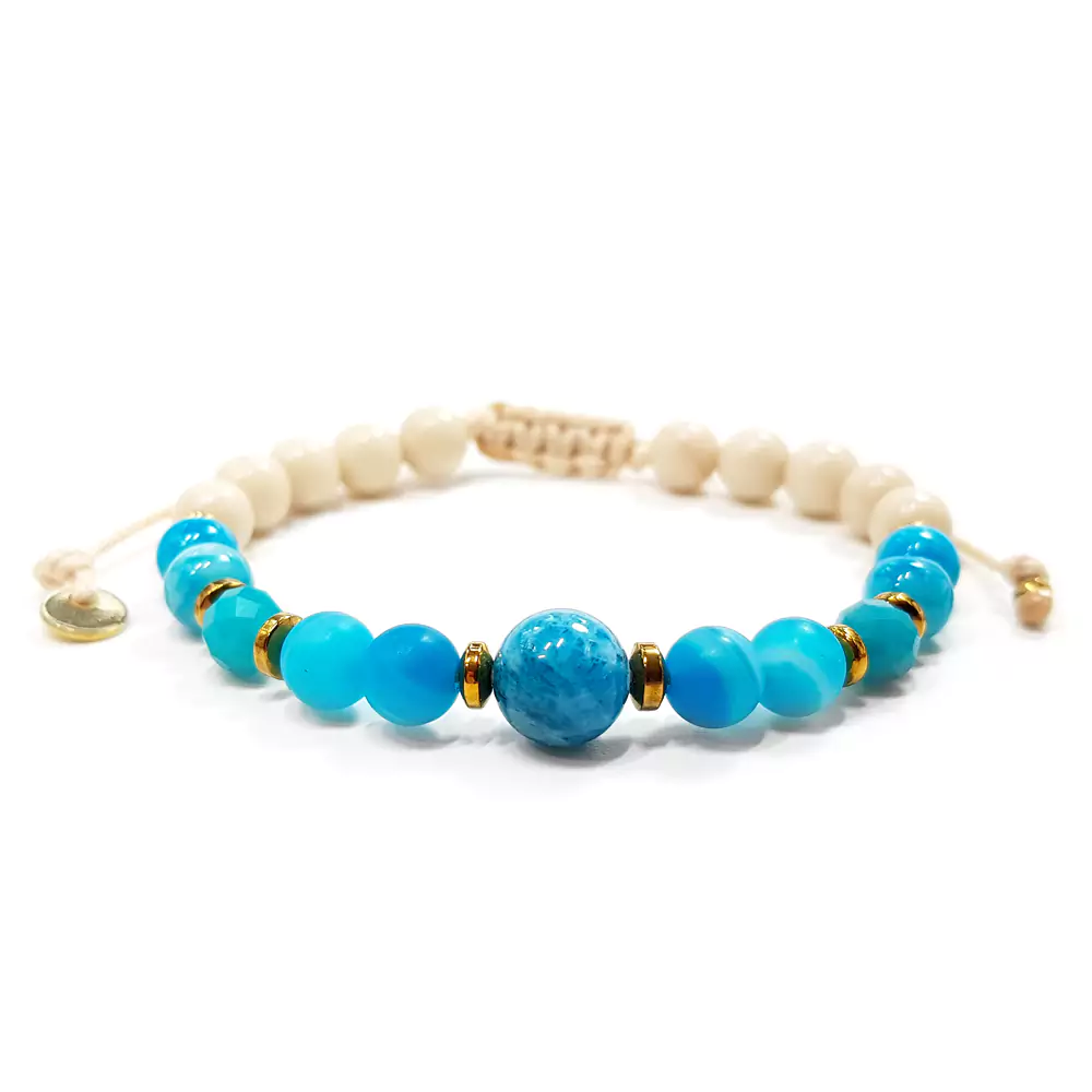 Bransoletka wykonana z kamieni naturalnych - apatytu niebieskiego, barwionego na niebiesko agatu, barwionego na niebiesko kwarcu, kamienia rzecznego i hematytu. Bazą bransoletki jest mocny sznurek. Dodatek stanowi zawieszka i blaszka z logo Magneska (stal chirurgiczna).