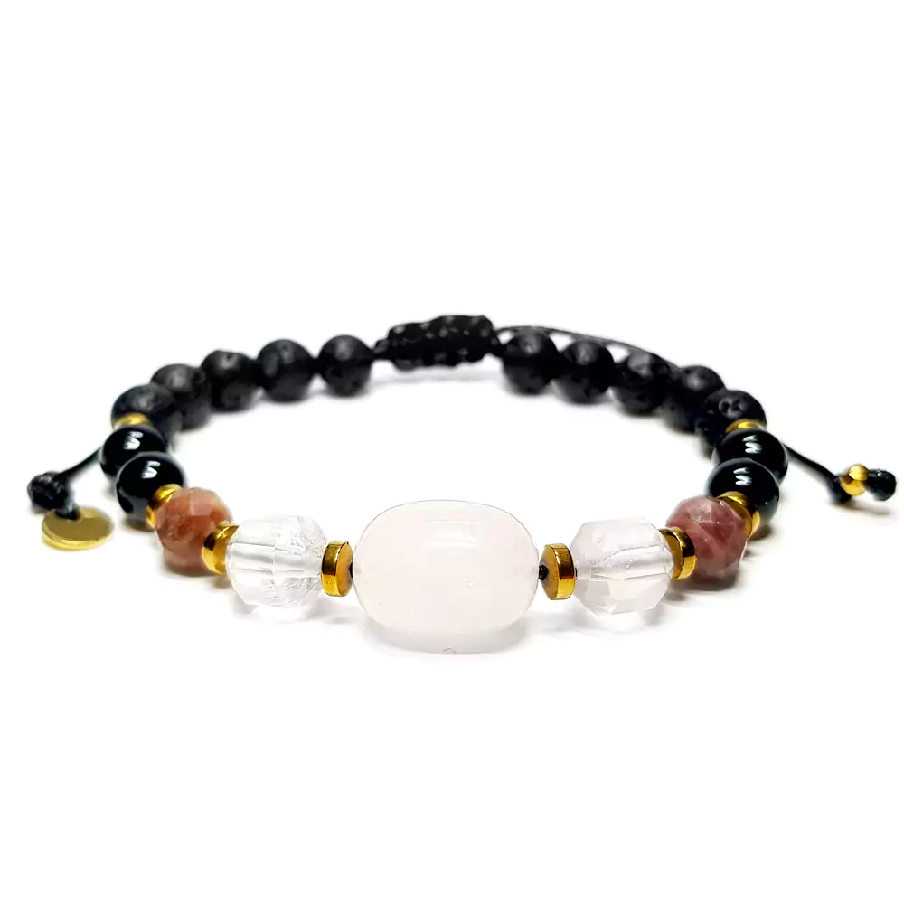 Bransoletka wykonana z kamieni naturalnych - kwarcu różowego, rodochrozytu, czarnego turmalinu, lawy wulkanicznej i hematytu. Bazą bransoletki jest mocny sznurek. Dodatek stanowi blaszka z logo Magneska (stal chirurgiczna).