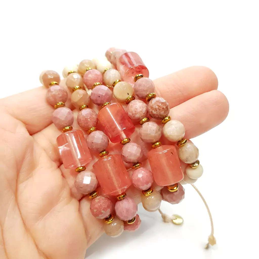 Pebbles damska bransoletka kwarc truskawkowy, rodonit, thulit, kamień słoneczny, kamień rzeczny i hematyt