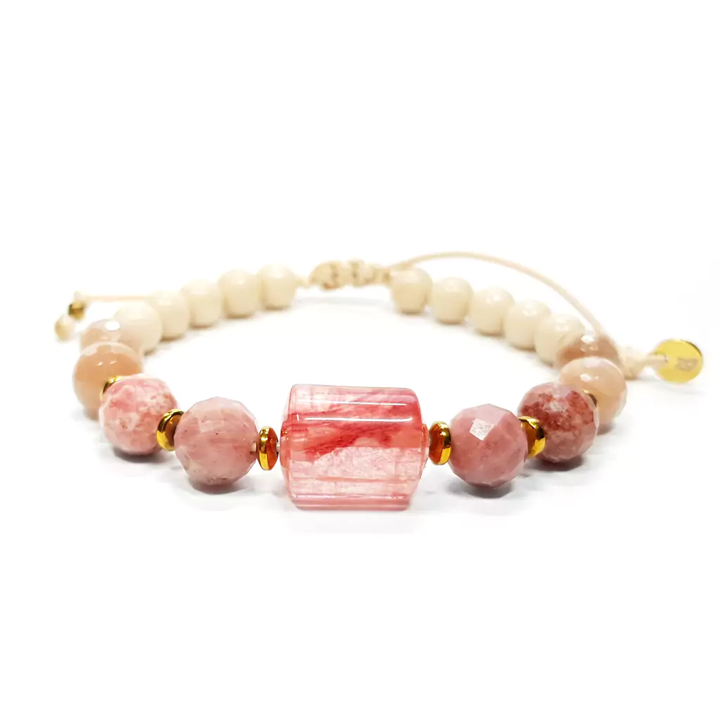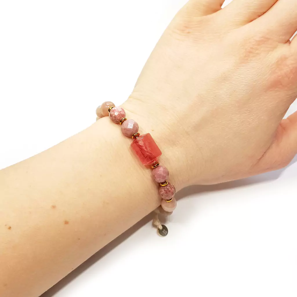 Bransoletka wykonana z kamieni naturalnych - kwarcu truskawkowego, rodonitu, thulitu, kamienia słonecznego, kamienia rzecznego i hematytu. Bazą bransoletki jest mocny sznurek. Dodatek stanowi zawieszka i blaszka z logo Magneska (stal chirurgiczna).