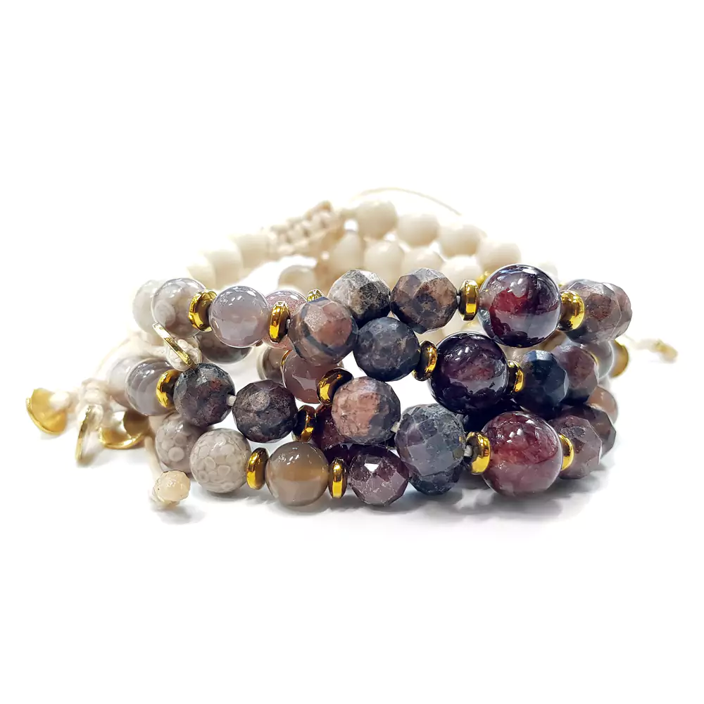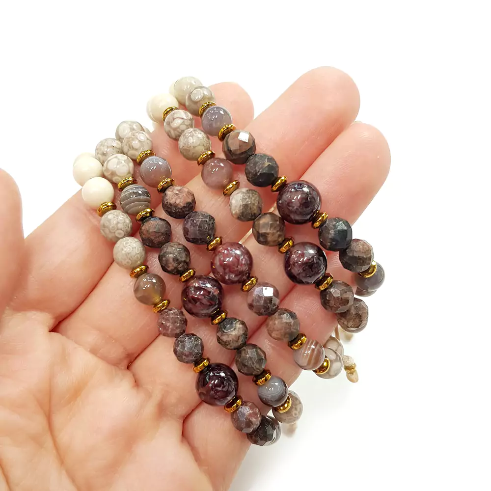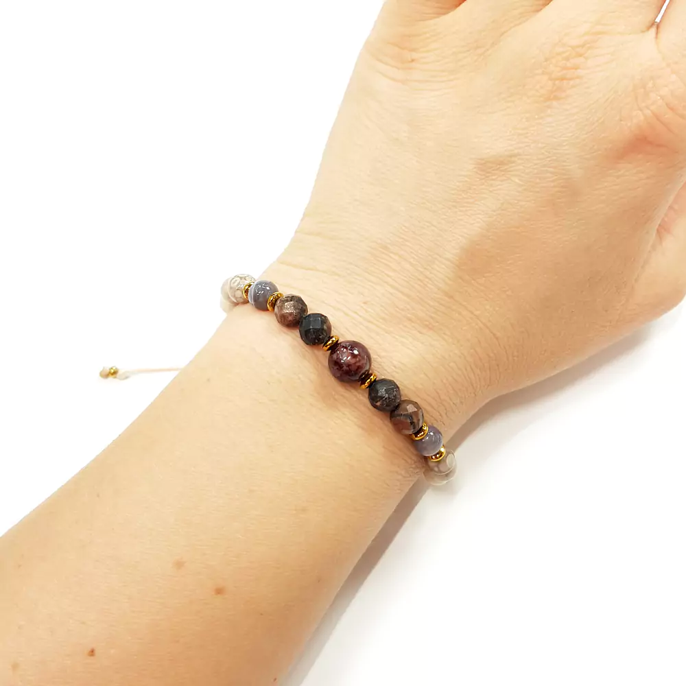 Pebbles damska bransoletka kwarc z hematytem, rodochrozyt, agat botswana, jaspis orbikularny, kamień rzeczny i hematyt