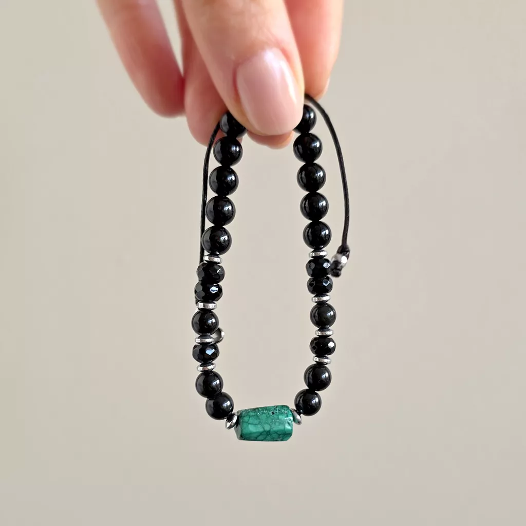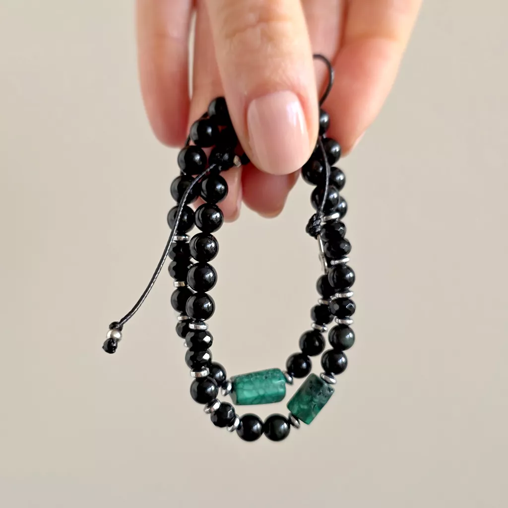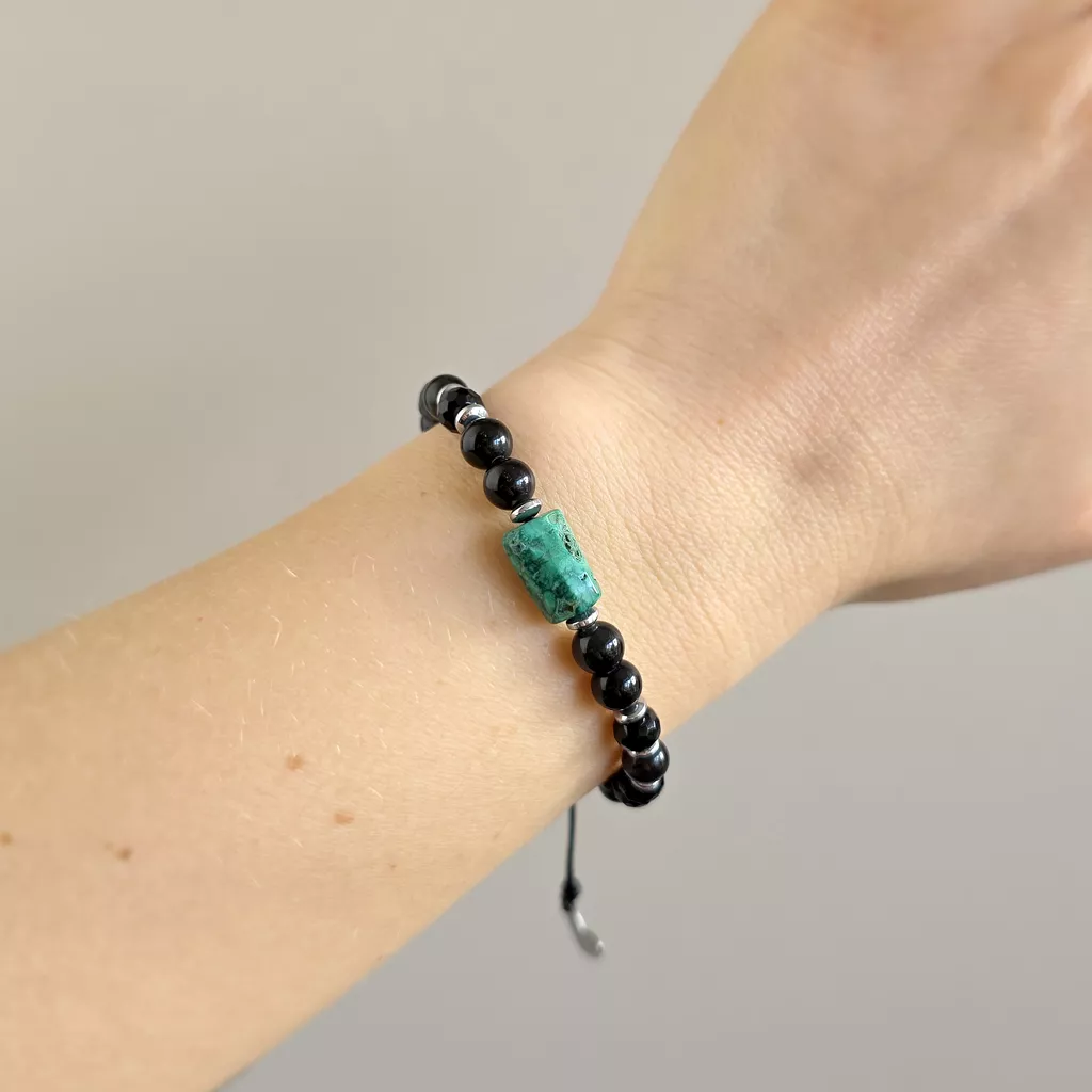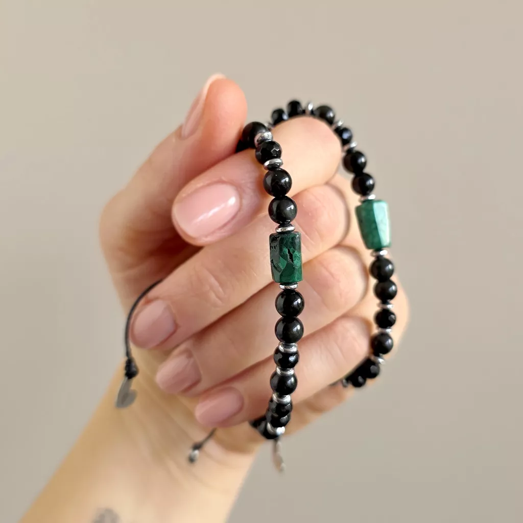 Bransoletka wykonana z kamieni naturalnych - malachitu, obsydianu tęczowego, onyksu, turmalinu czarnego i hematytu. Bazą bransoletki jest mocny sznurek. Dodatek stanowi blaszka z logo Magneska (stal chirurgiczna).