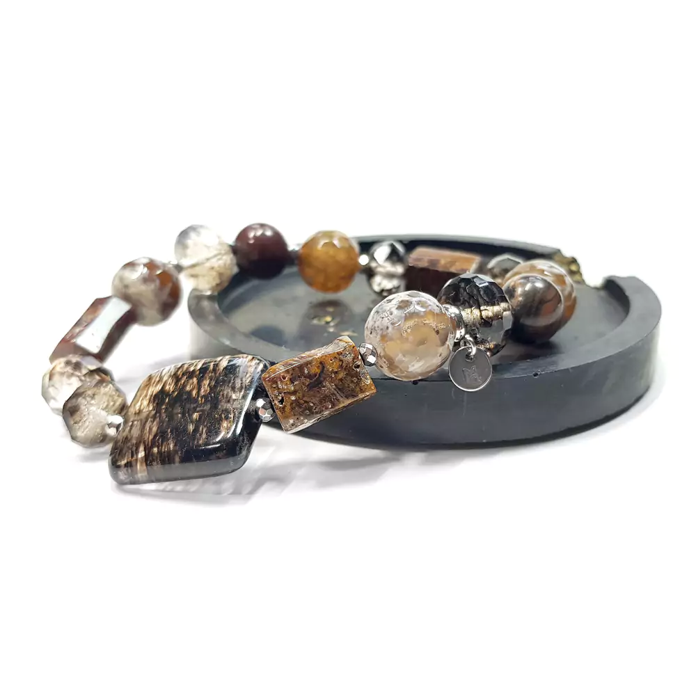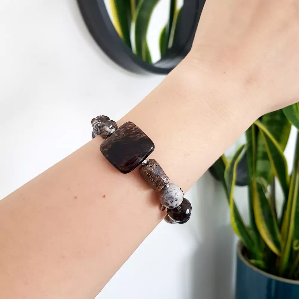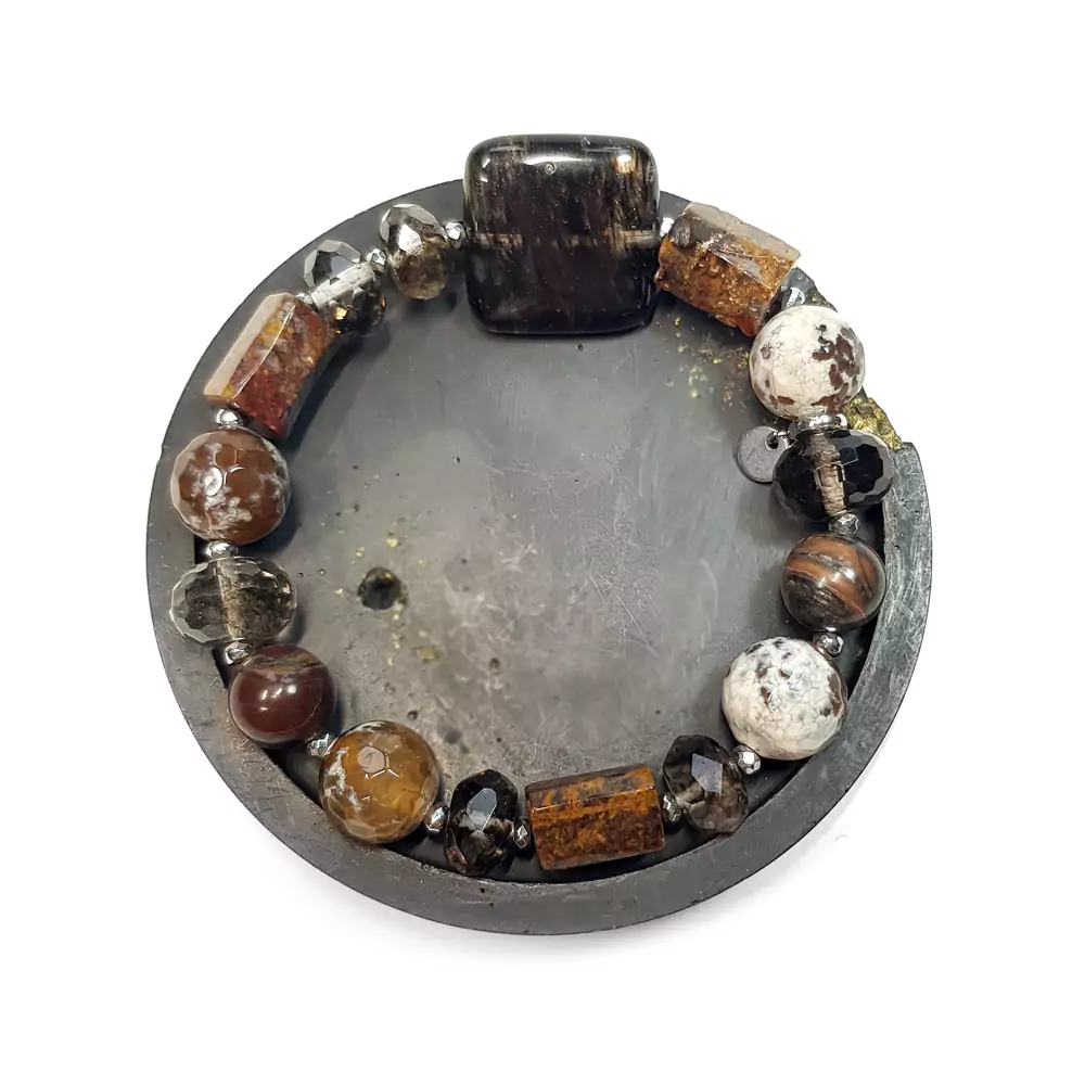 Bransoletka wykonana z miksu kamieni. W bransoletce znajdziesz: brązowy kwarc mszysty, pietersyt, agat ognisty, rodonit i hematyt. Bazą bransoletki jest mocna, silikonowa gumka. Dodatek stanowi blaszka z logo Magneska.