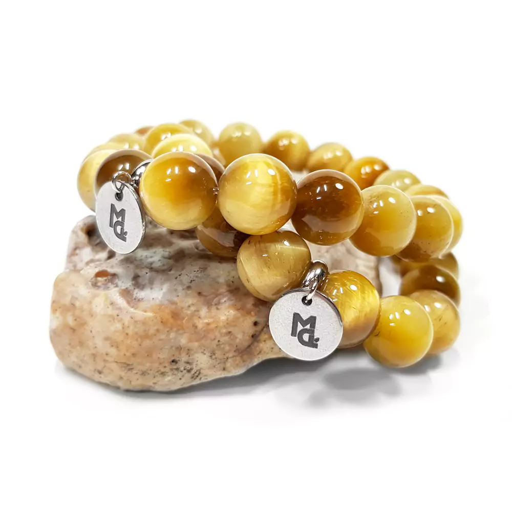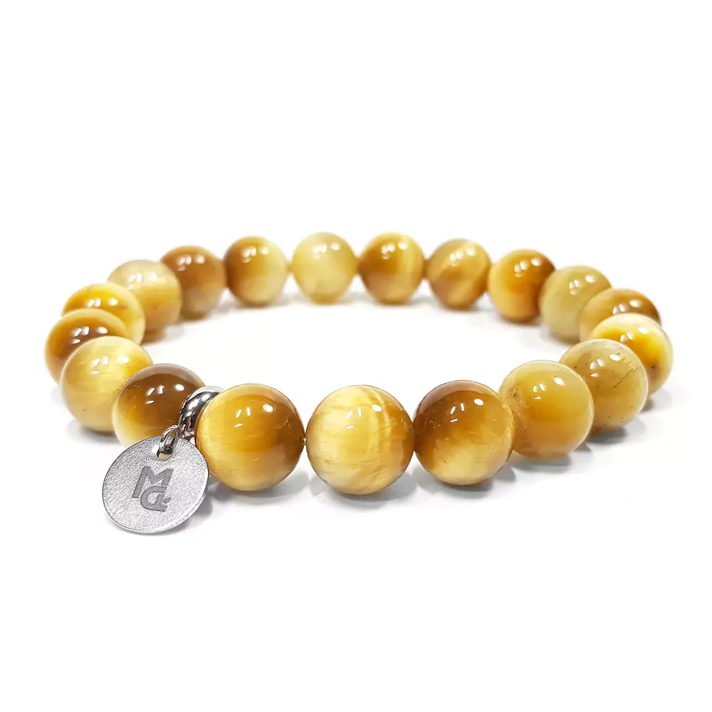 Bransoletka wykonana z 10 mm kuleczek żółtego tygrysiego oka, mocnej, silikonowej gumki oraz grawerowanej blaszki Magneska ze stali chirurgicznej.
