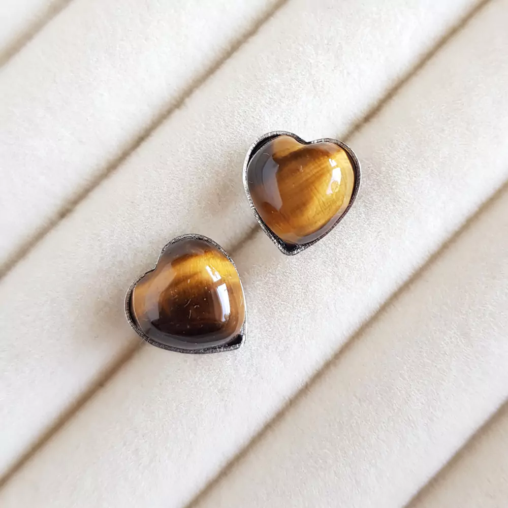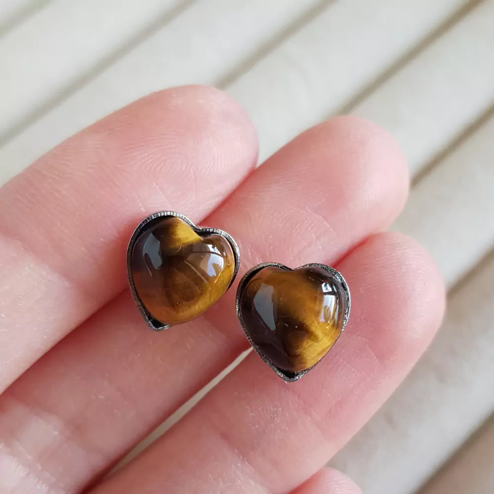 Kolczyki wykonane z metalowych baz ze stali chirurgicznej oraz 1 cm serduszek tygrysiego oka.