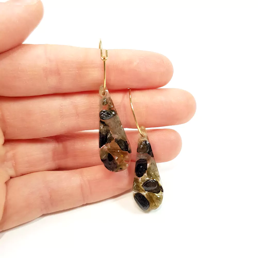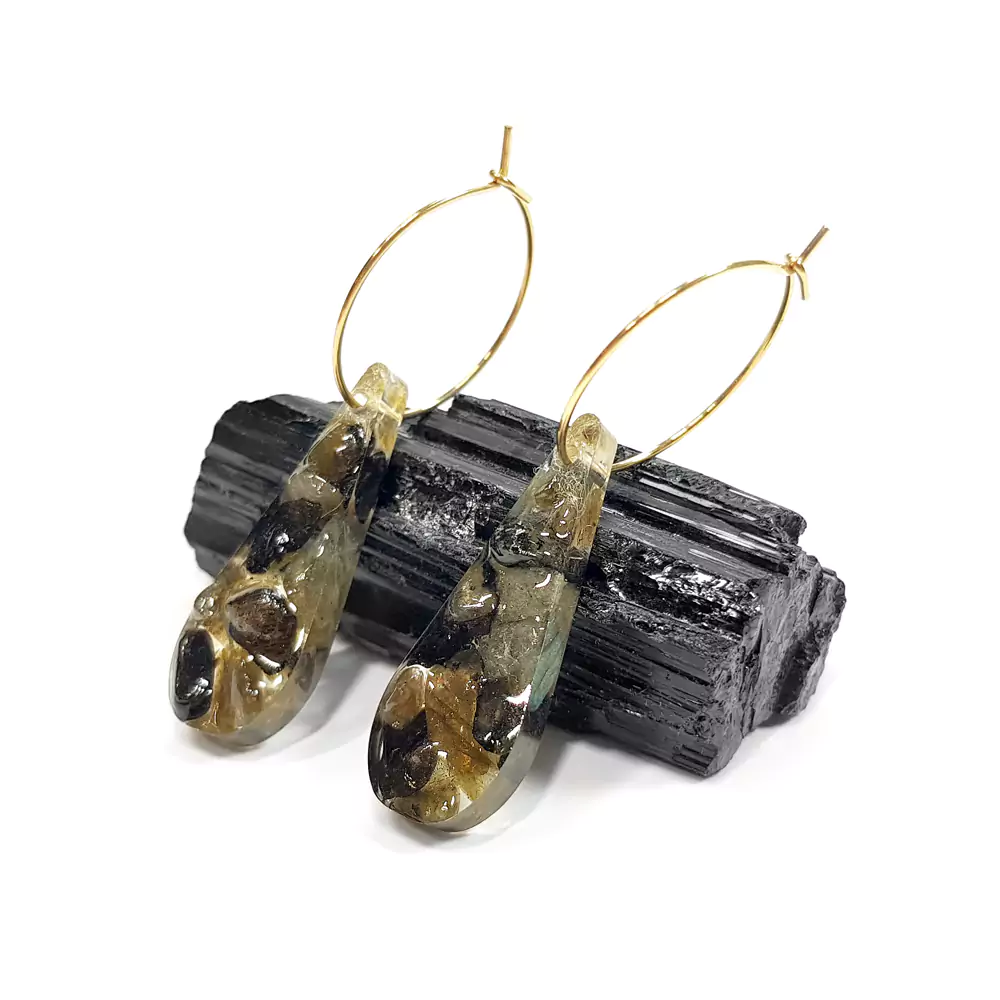 Kolczyki wykonane z drobnych bryłek labradorytu, w dwóch odcieniach, zatopionych w żywicy oraz kółeczek ze stali chirurgicznej.