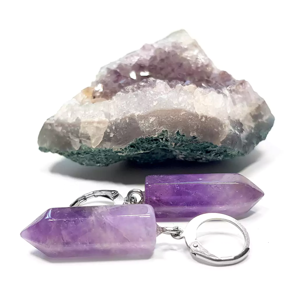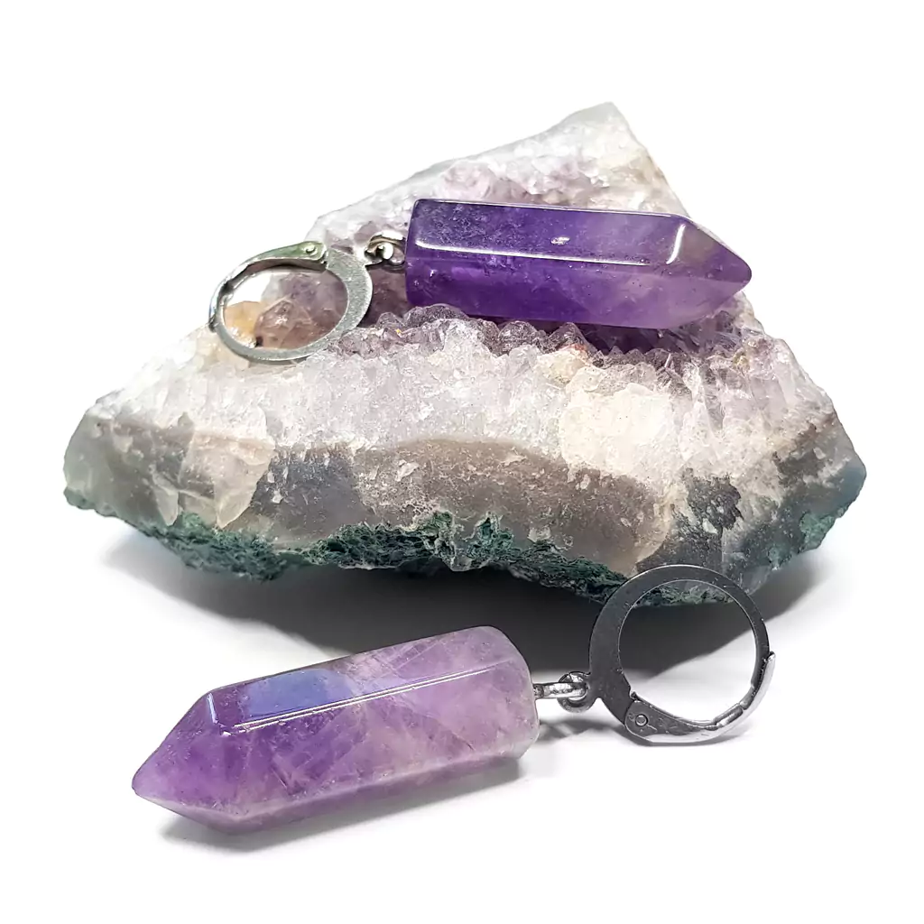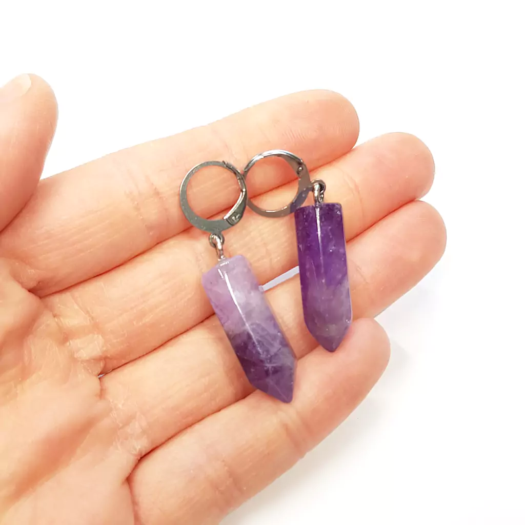 Kolczyki wykonane ręcznie z elementów metalowych ze stali chirurgicznej oraz sopli ametystu.