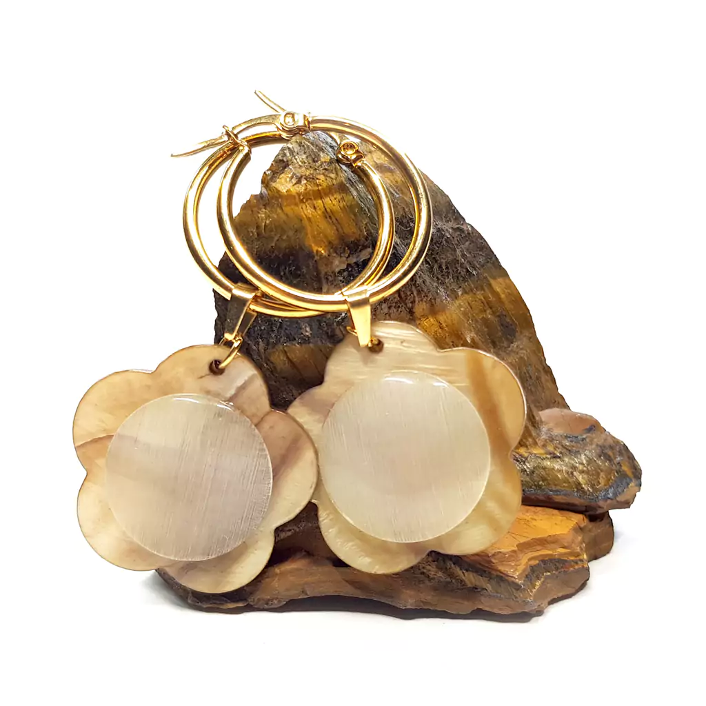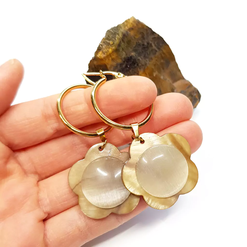 Kolczyki wykonane ręcznie z elementów metalowych ze stali chirurgicznej oraz beżowych kwiatków z masy perłowej w złocistym odcieniu i szklanych kaboszonów kociego oka w kolorze kremowym.