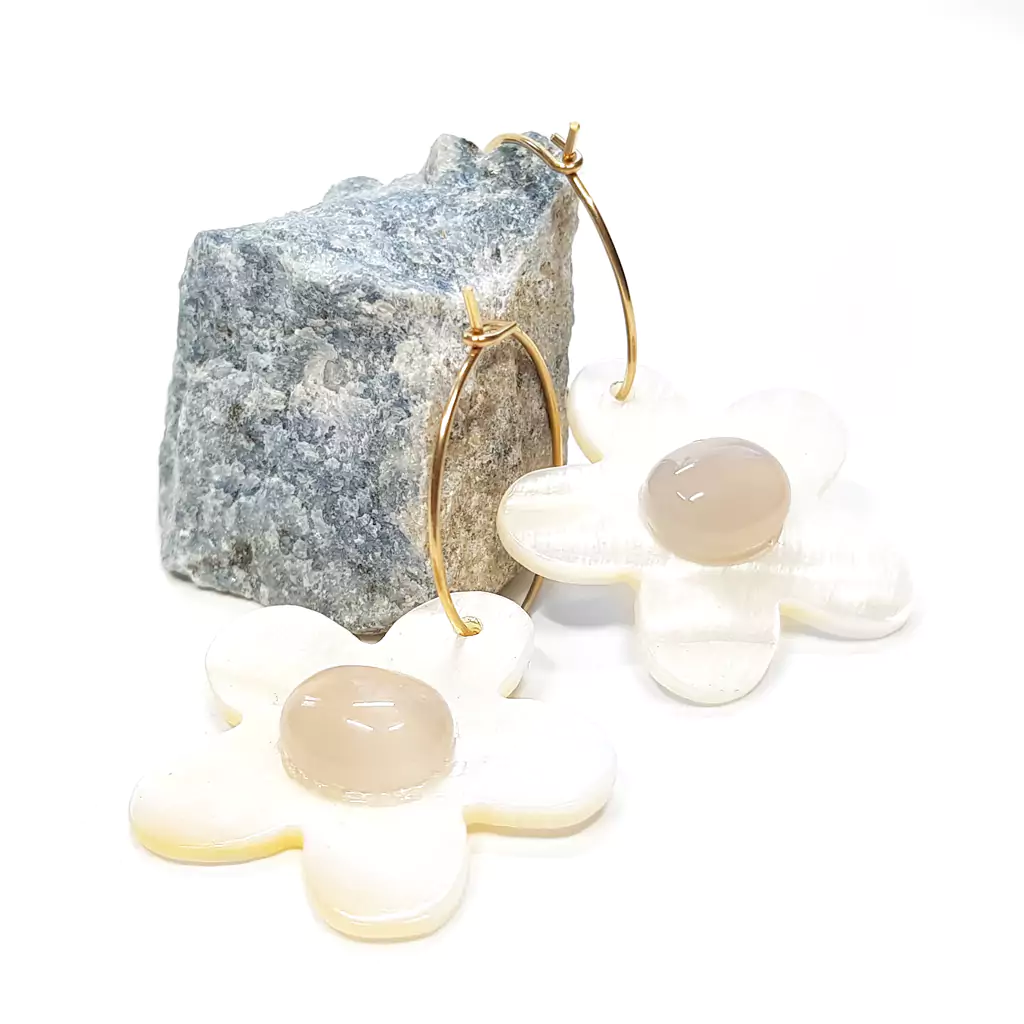Kolczyki wiszące kremowe kwiatki i agat szary na złotych kółeczkach stal chirurgiczna