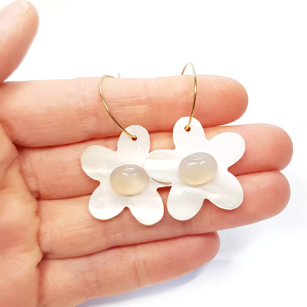 Kolczyki wykonane ręcznie z elementów metalowych ze stali chirurgicznej oraz kremowych kwiatków z masy perłowej i kaboszonów agatu szarego.