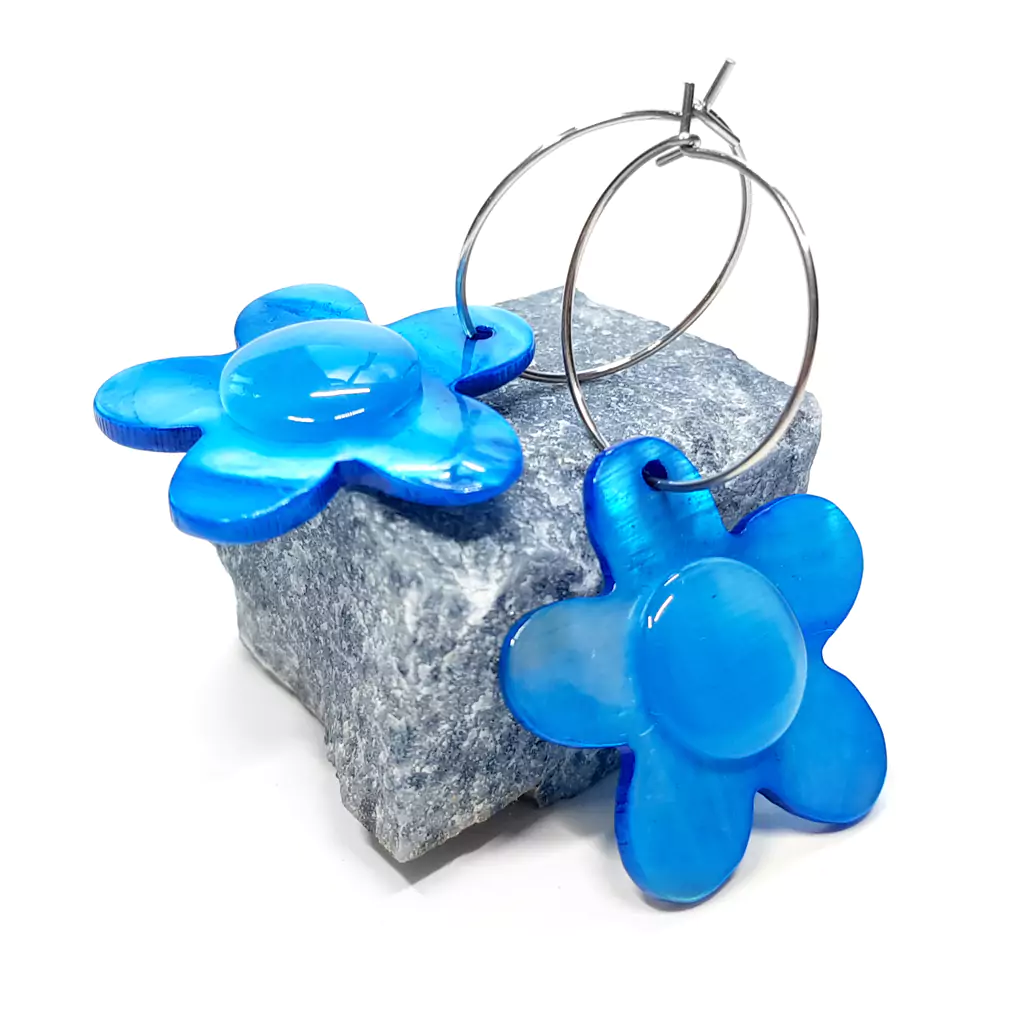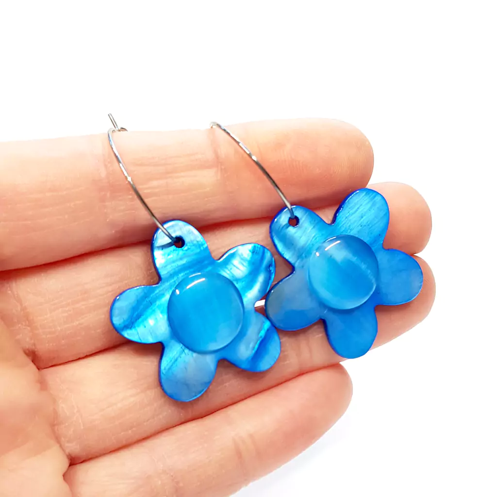 Kolczyki wykonane ręcznie z elementów metalowych ze stali chirurgicznej oraz niebieskich kwiatków z masy perłowej i szklanych kaboszonów kociego oka w kolorze niebieskim.