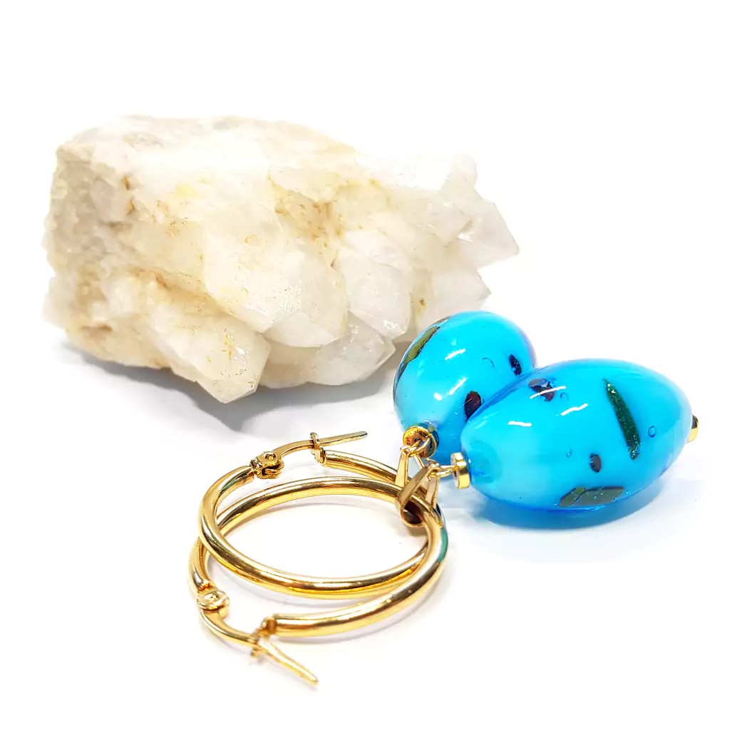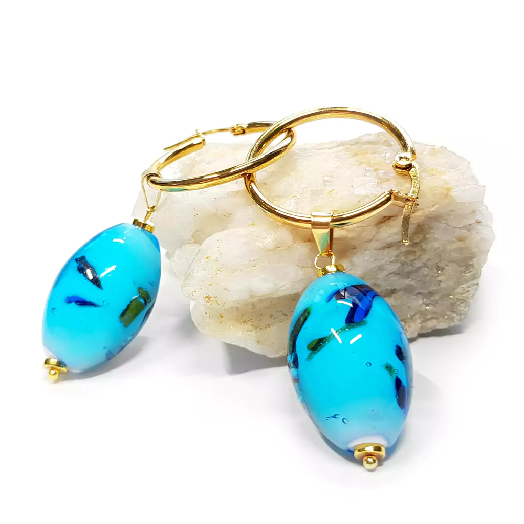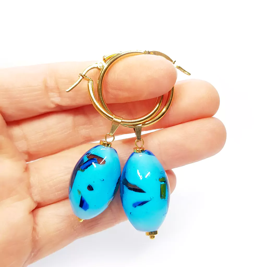 Kolczyki wiszące niebieskie szklane oliwki na złotych kółeczkach stal chirurgiczna