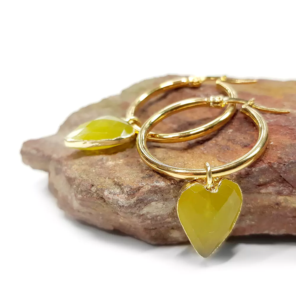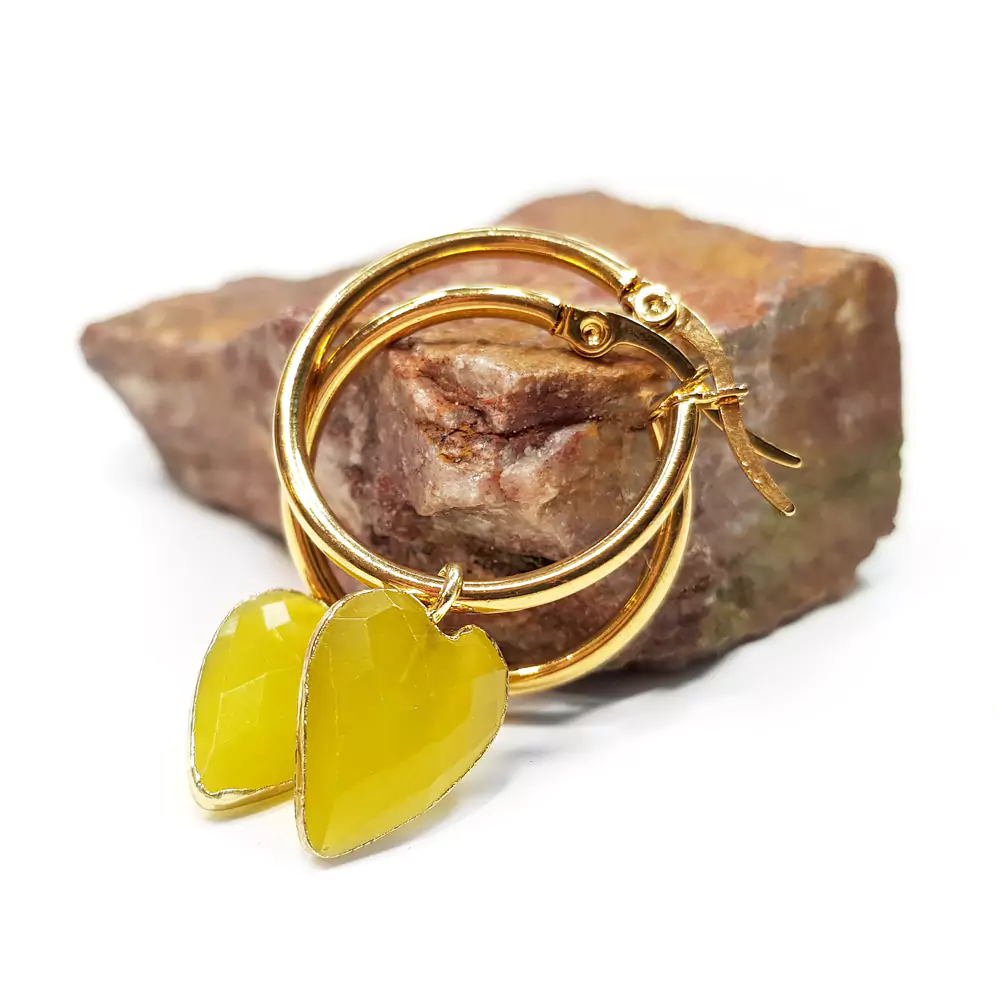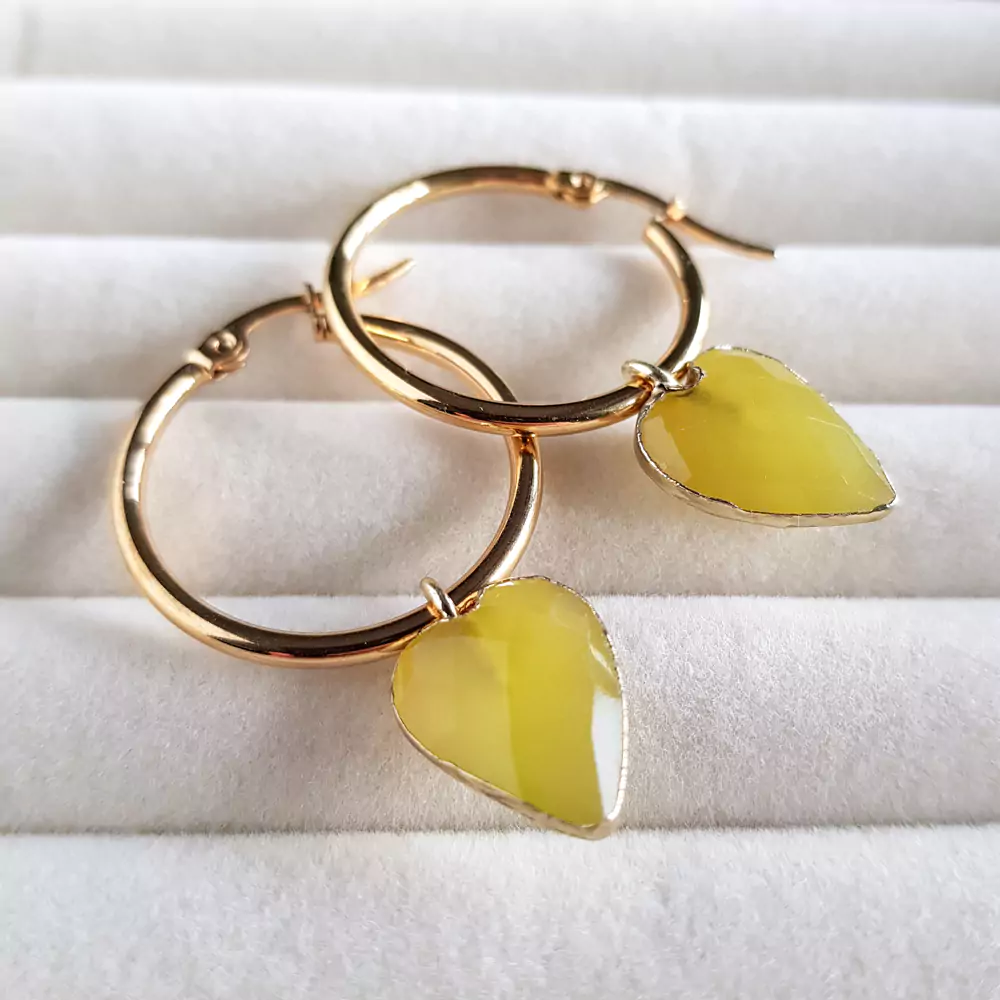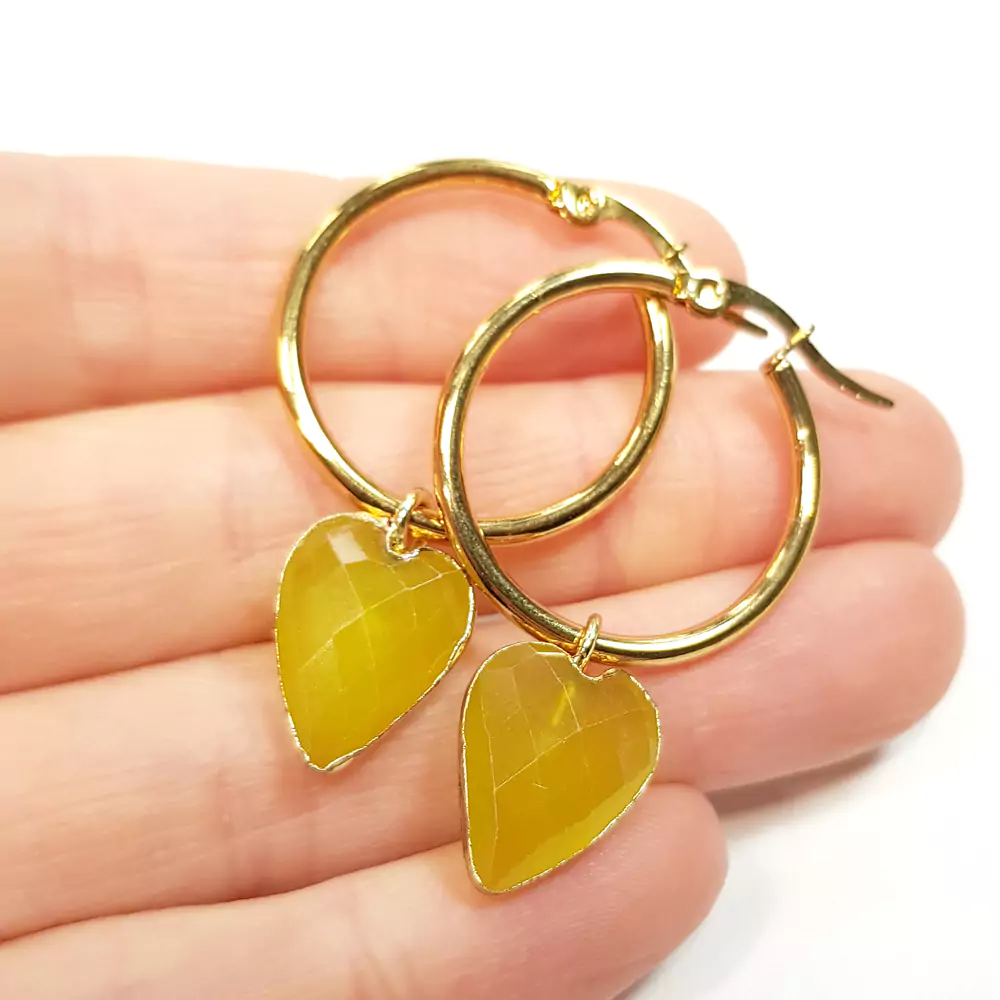 Kolczyki wiszące unikaty agat żółty serca na złotych kółeczkach stal chirurgiczna