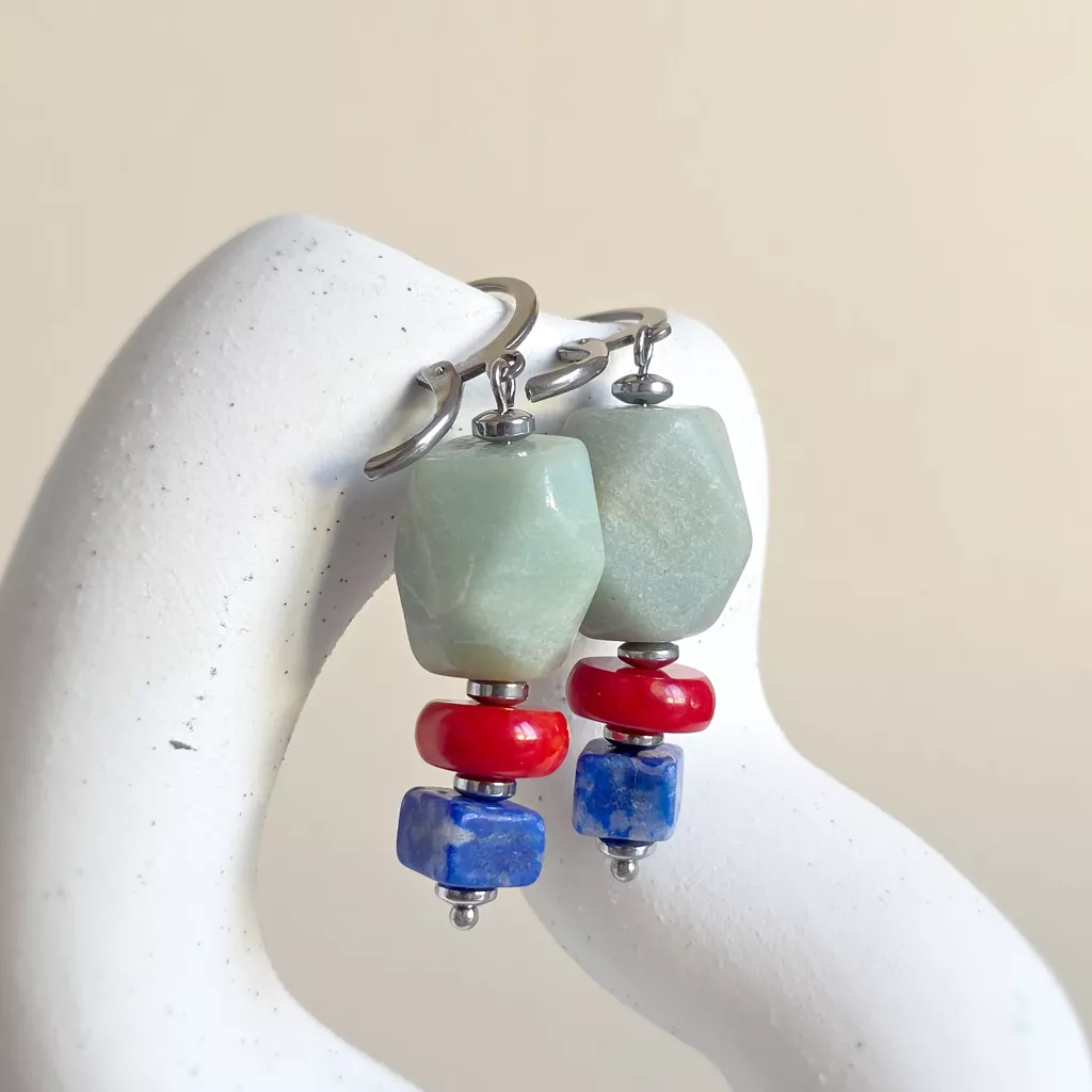 Kolczyki wiszące na stali chirurgicznej mają prostą, pionową formę opartą na zestawieniu trzech kamieni o mocnym kontraście kolorystycznym. Głównym elementem kompozycji jest amazonit w jasnej, zgaszonej tonacji mięty i szałwii, o gładkiej powierzchni i wyraźnej bryle. Poniżej umieściłam koral w intensywnej czerwieni oraz lapis lazuli w głębokim, nasyconym błękicie. Całość dopełniają drobne przekładki z hematytu w stalowym odcieniu, które porządkują układ i podkreślają to nietypowe zestawienie barw. Kolczyki mają oszczędną formę, ale dzięki wyrazistym kamieniom pozostają mocnym akcentem.