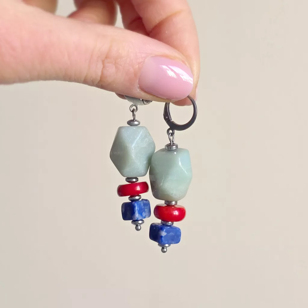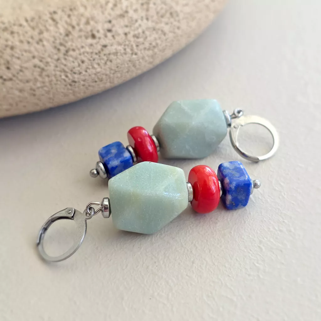 Kolczyki wiszące unikaty amazonit, koral, lapis lazuli i hematyt stal chirurgiczna
