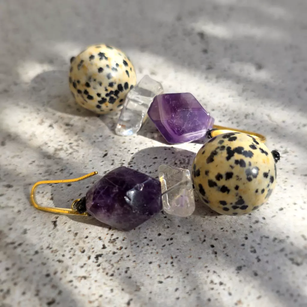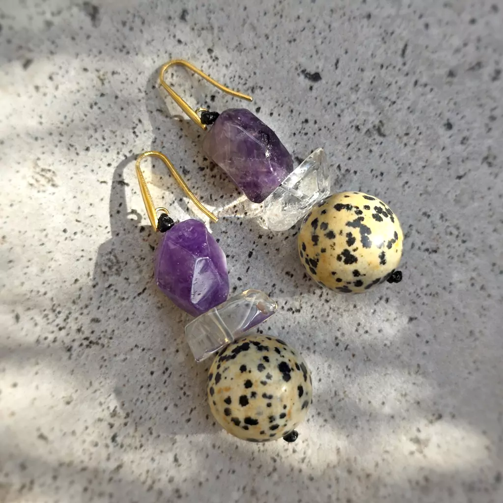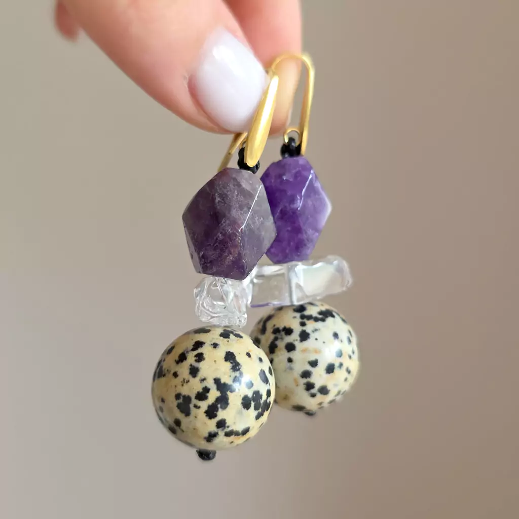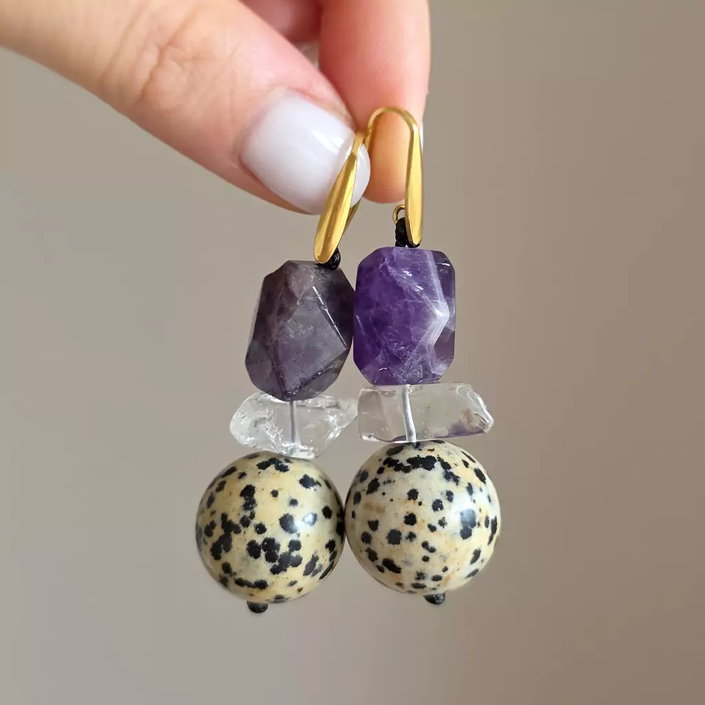 Kolczyki wykonane ręcznie z elementów metalowych ze stali chirurgicznej oraz kamieni naturalnych - ametystu, kryształu górskiego, jaspisu dalmatyńczyka i hematytu.