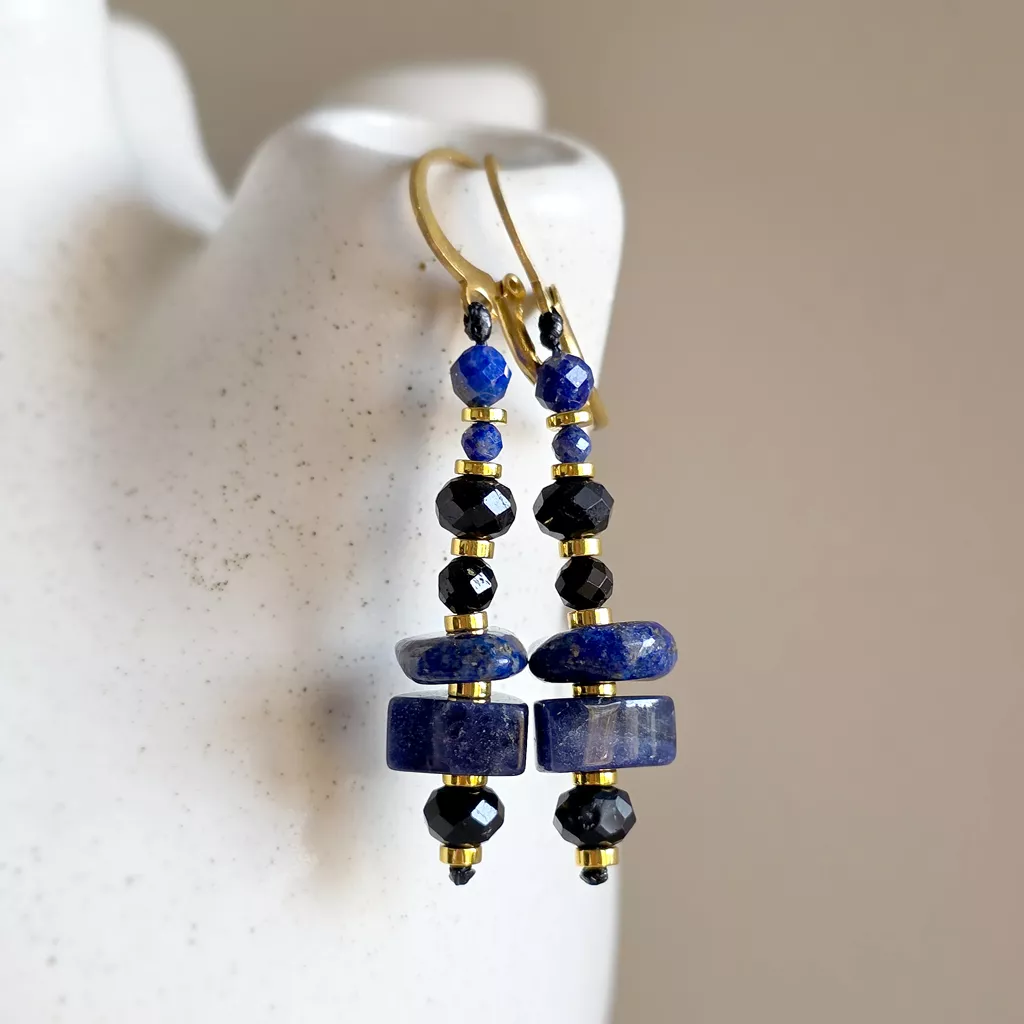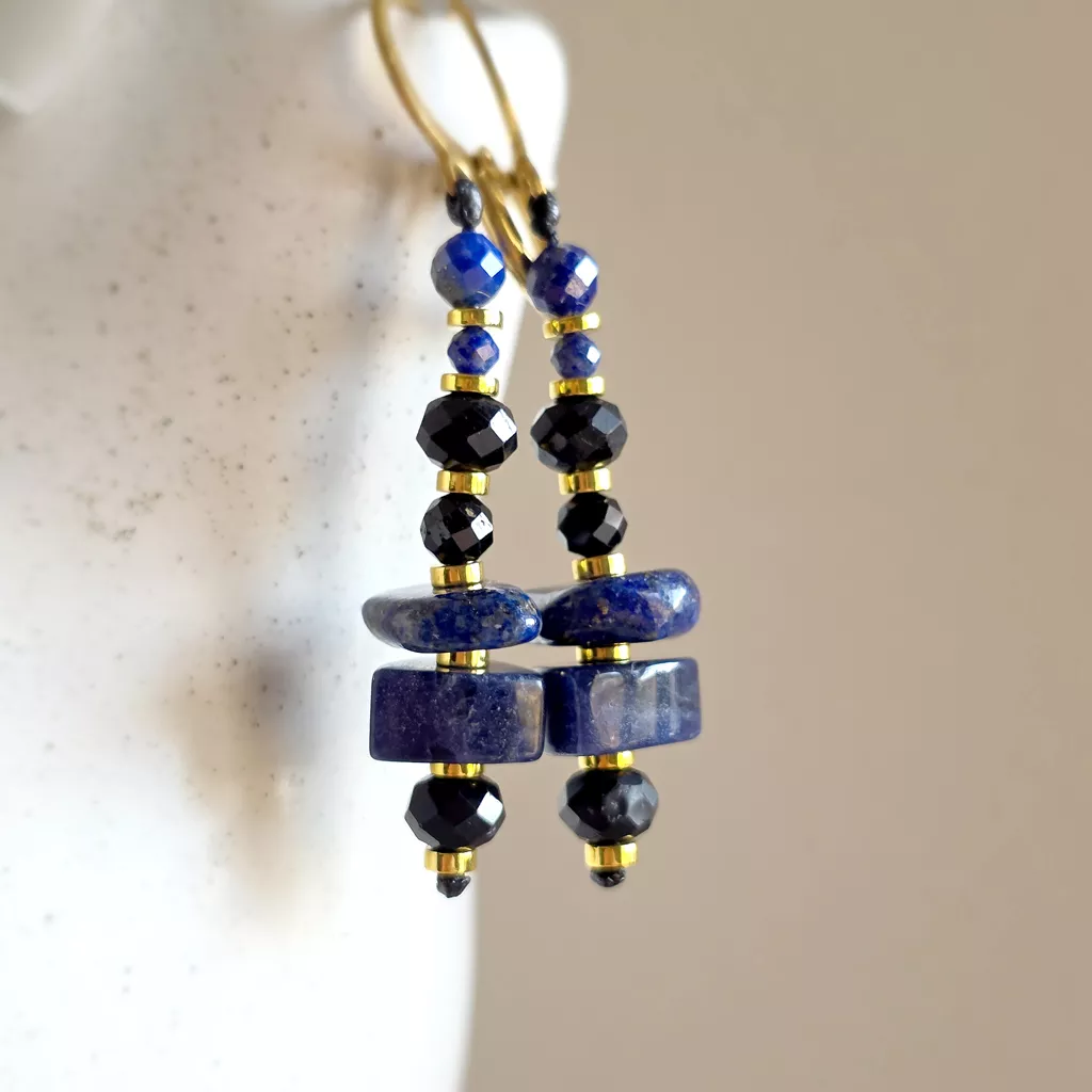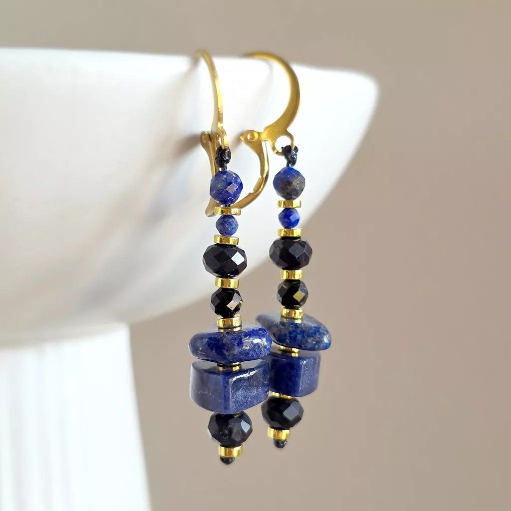 Kolczyki wiszące unikaty czarny turmalin, lapis lazuli, hematyt i złota stal chirurgiczna v.2