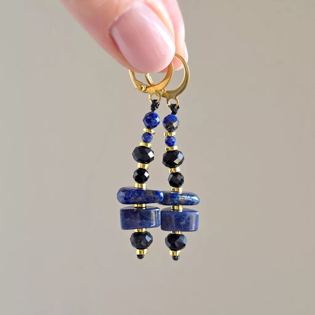 Kolczyki wykonane ręcznie z elementów metalowych ze stali chirurgicznej oraz kamieni naturalnych - lapisu lazuli i czarnego turmalinu. Złote przekładki - hematyt.