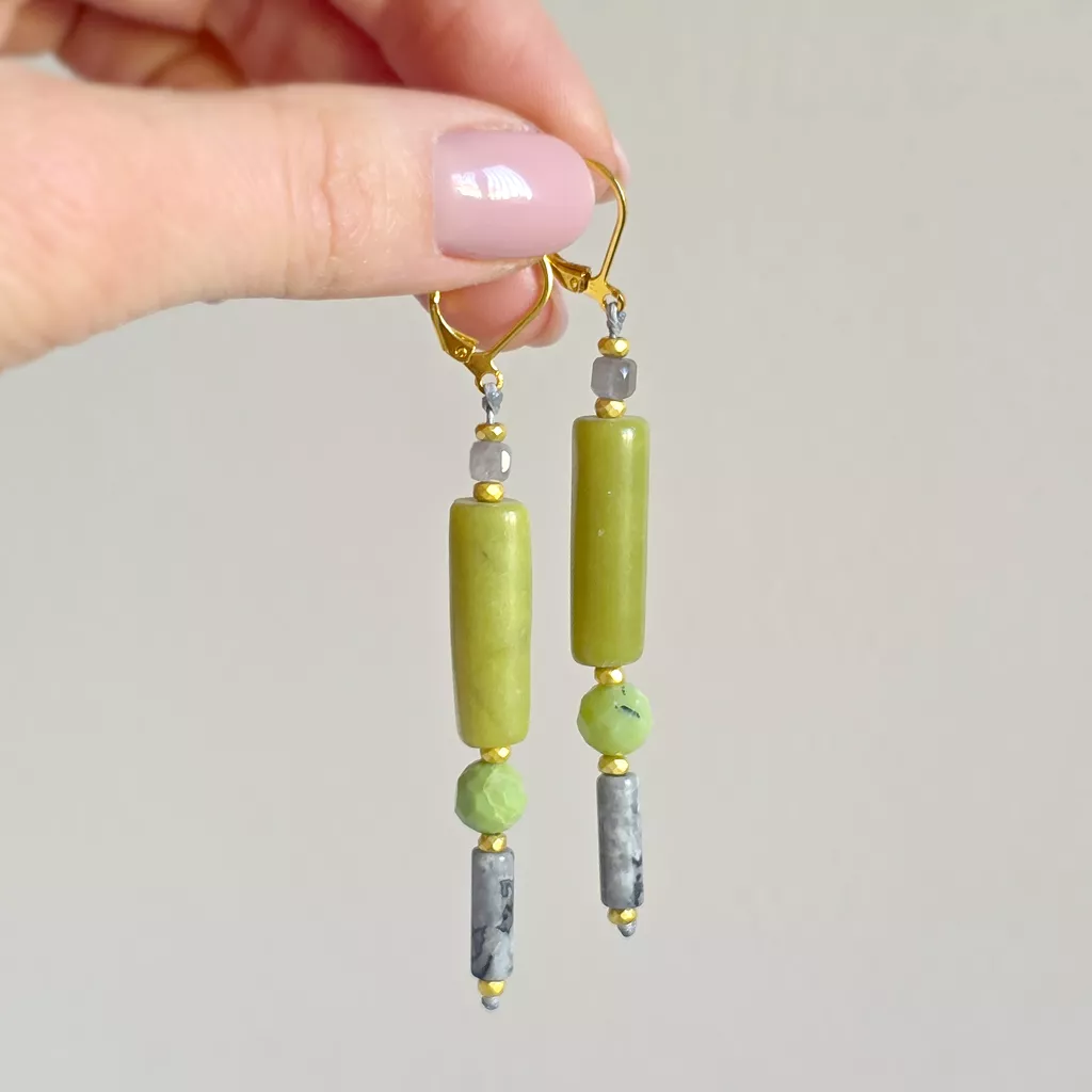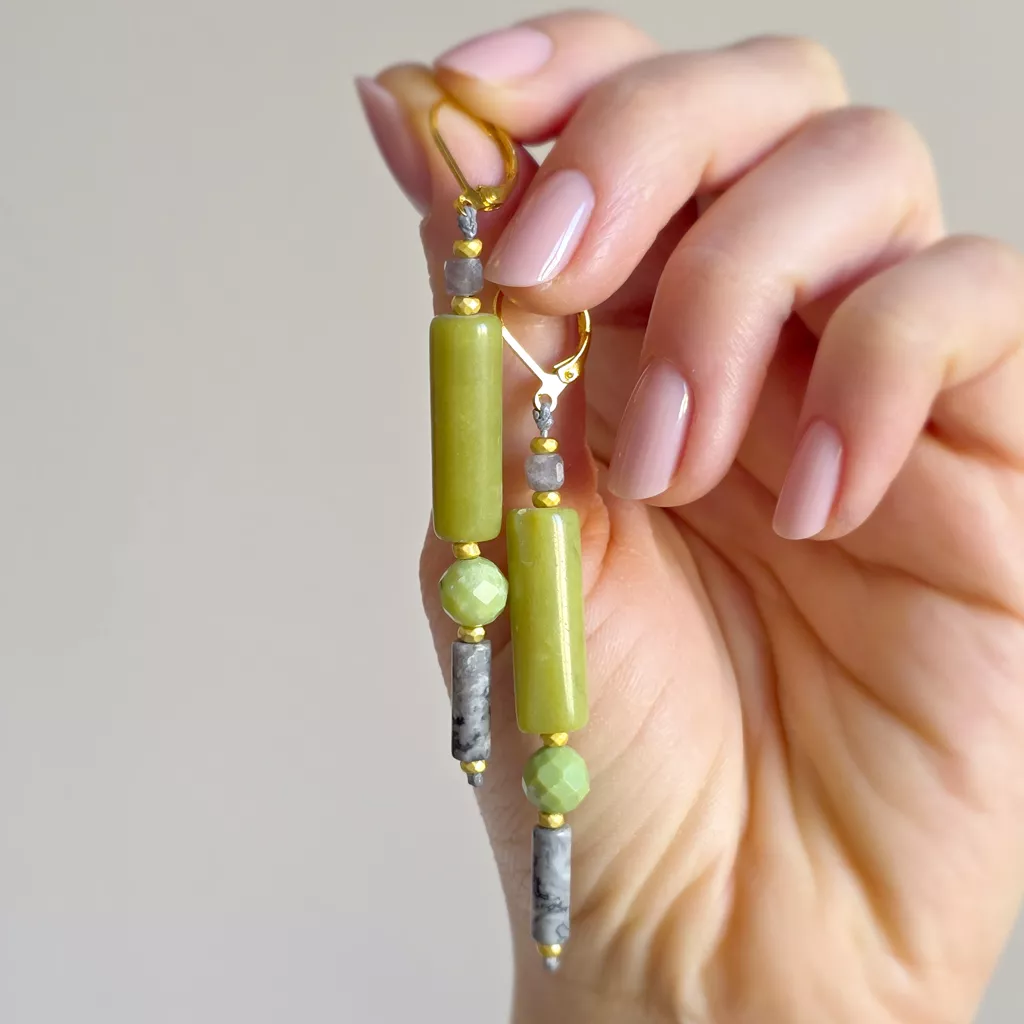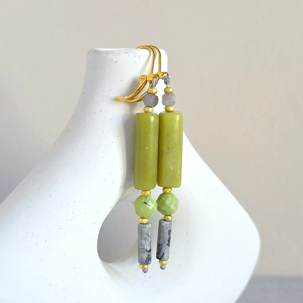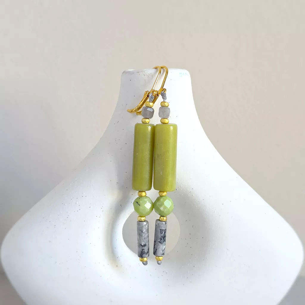 Te wiszące kolczyki to harmonijne połączenie naturalnych kamieni w spokojnej, eleganckiej kolorystyce inspirowanej naturą. Kompozycja fluorytu, jadeitu, chryzoprazu, jaspisu szarego i hematytu tworzy biżuterię subtelną, ale pełną charakteru.