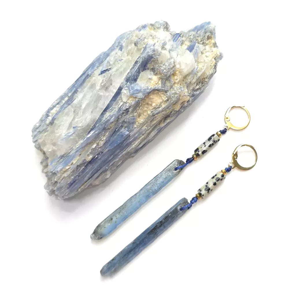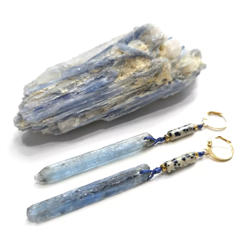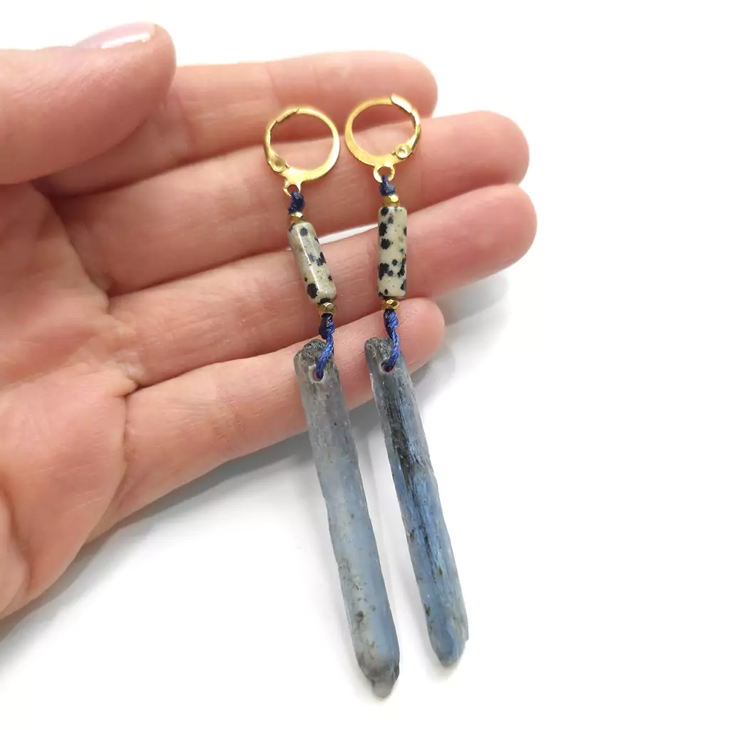 Kolczyki wykonane ręcznie z elementów metalowych ze stali chirurgicznej oraz kamieni naturalnych - patyczków jaspisu dalmatyńczyka i surowych bryłek kyanitu z czarnym turmalinem. Złote przekładki - hematyt.