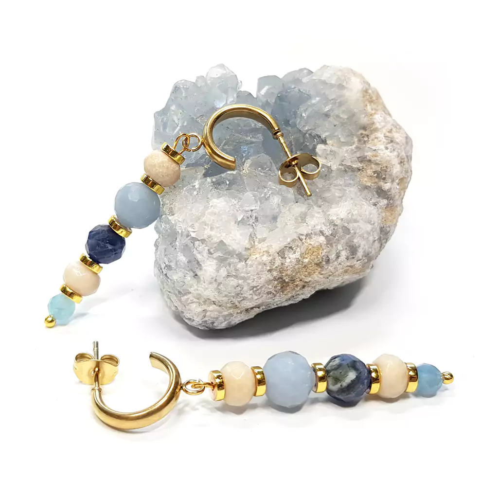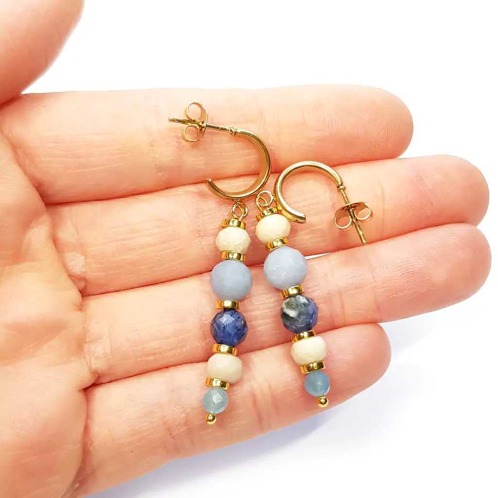 Kolczyki wiszące unikaty kamień rzeczny, akwamaryn, sodalit i hematyt złota stal chirurgiczna