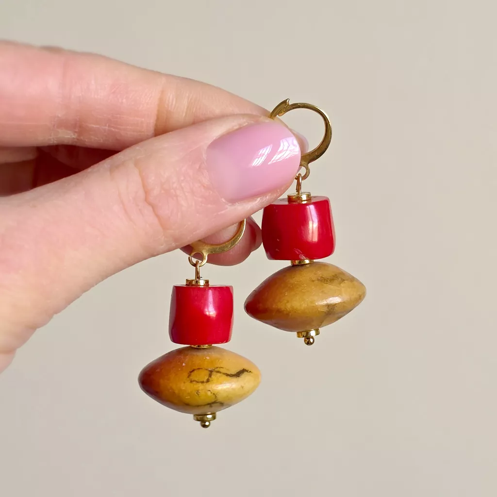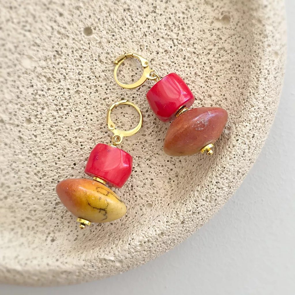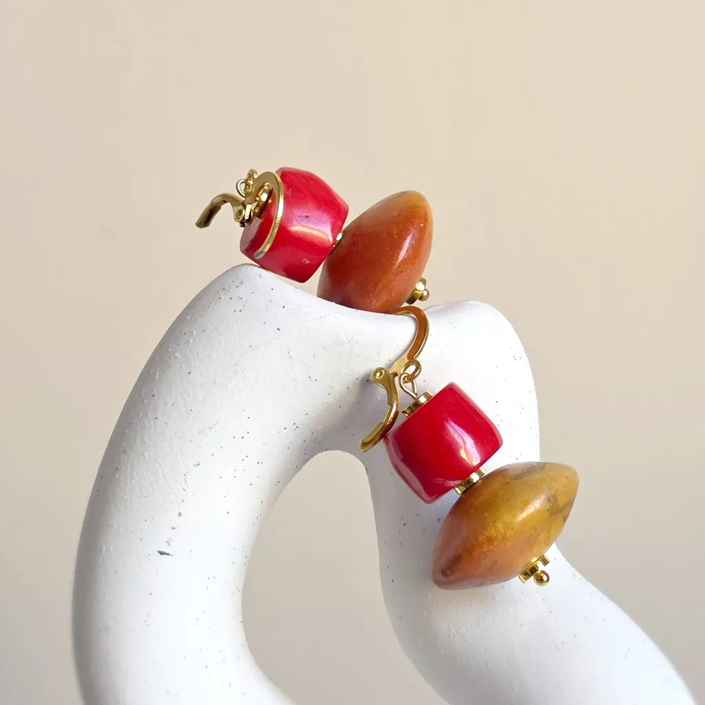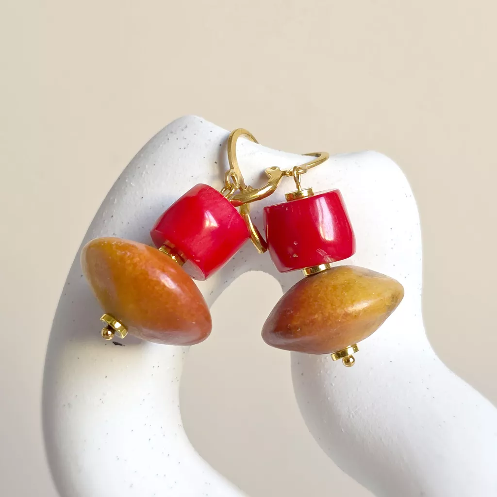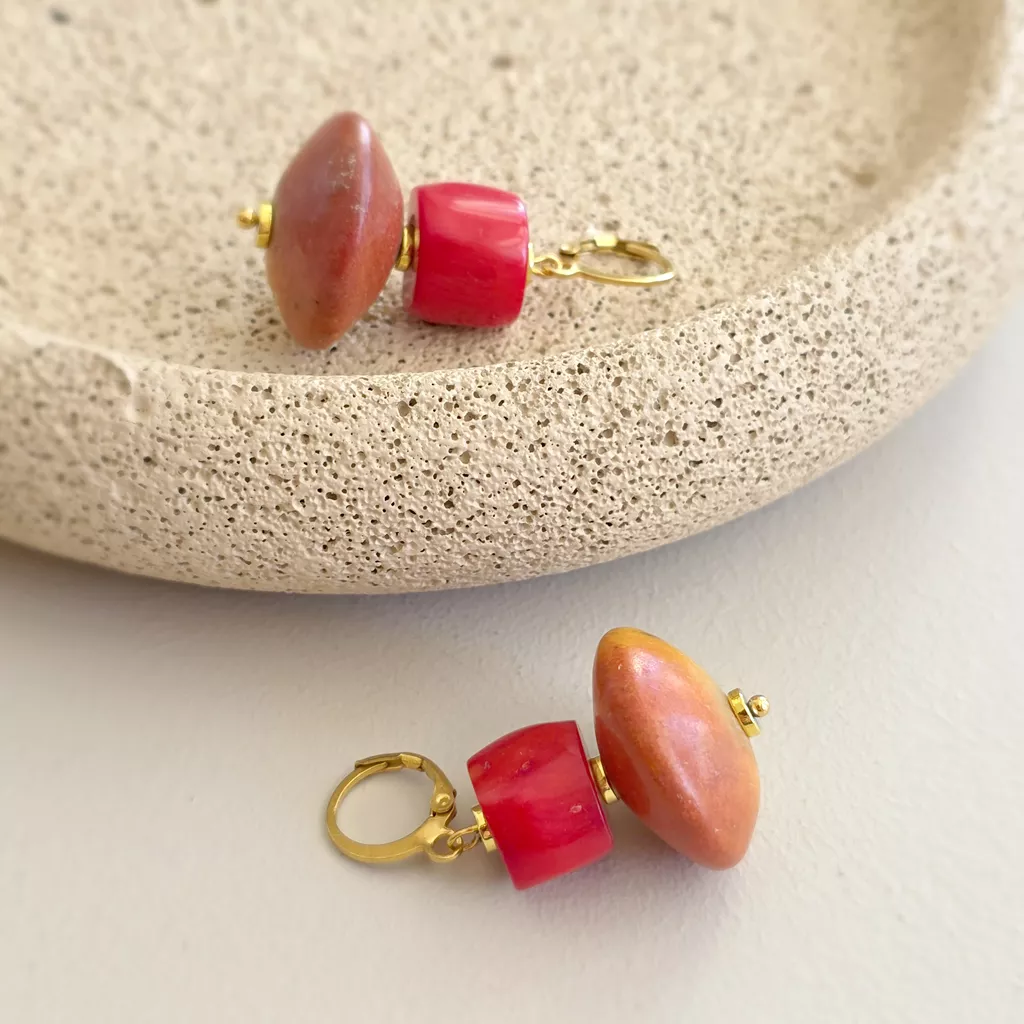 Kolczyki wiszące na złotej stali chirurgicznej, w których postawiłam na prostą, mocną formę opartą na zestawieniu dwóch wyraźnych elementów. Górną część tworzy koral w intensywnym, nasyconym odcieniu czerwieni, o gładkiej powierzchni i wyrazistym połysku. Poniżej zawiesiłam koral pomarańczowy o większej, spłaszczonej formie. Kontrast między soczystą czerwienią a ziemistym połyskiem sprawia, że kolczyki są zdecydowane w odbiorze, ale pozostają oszczędne w formie.