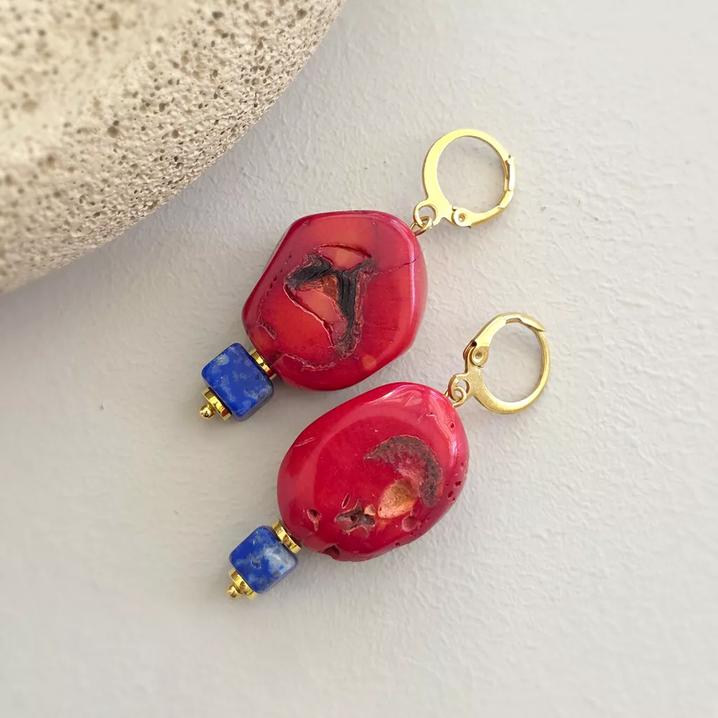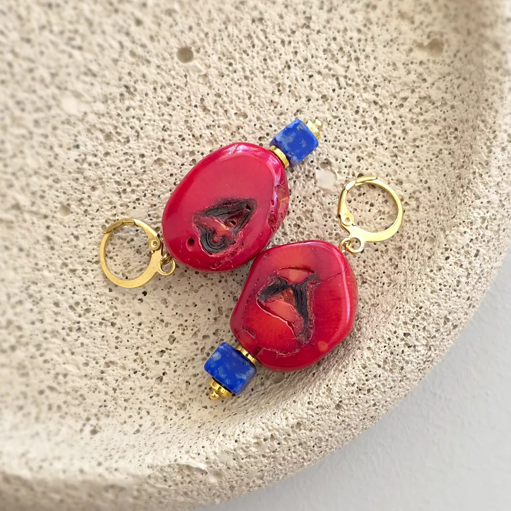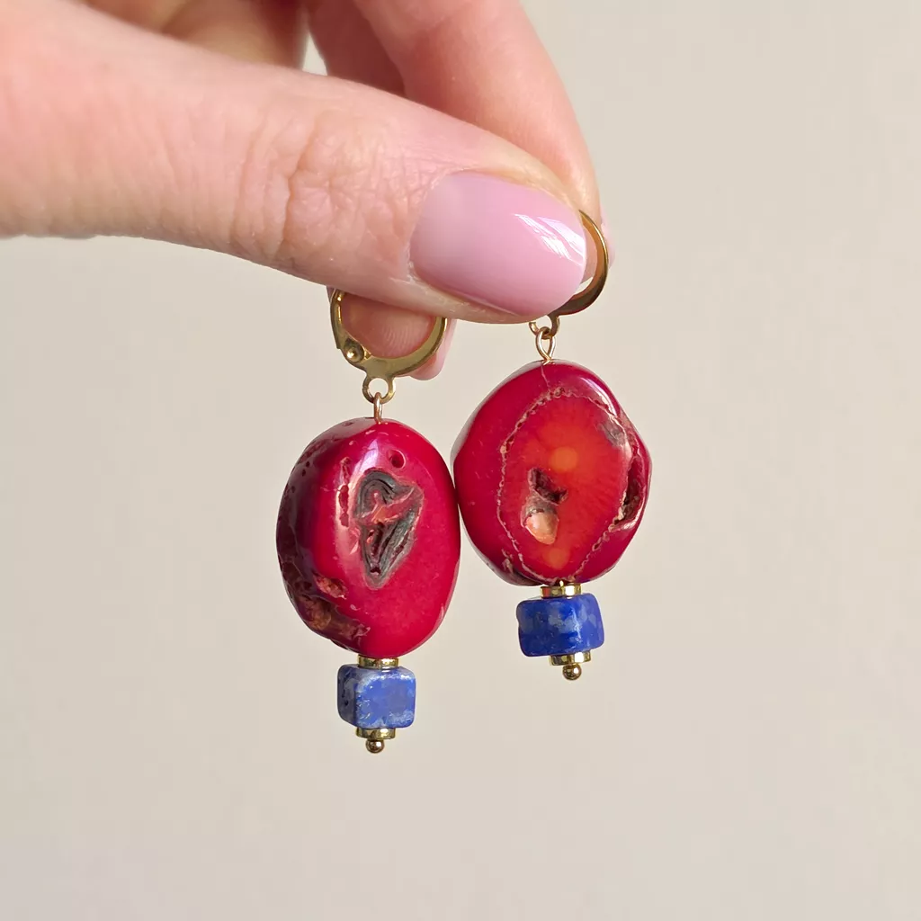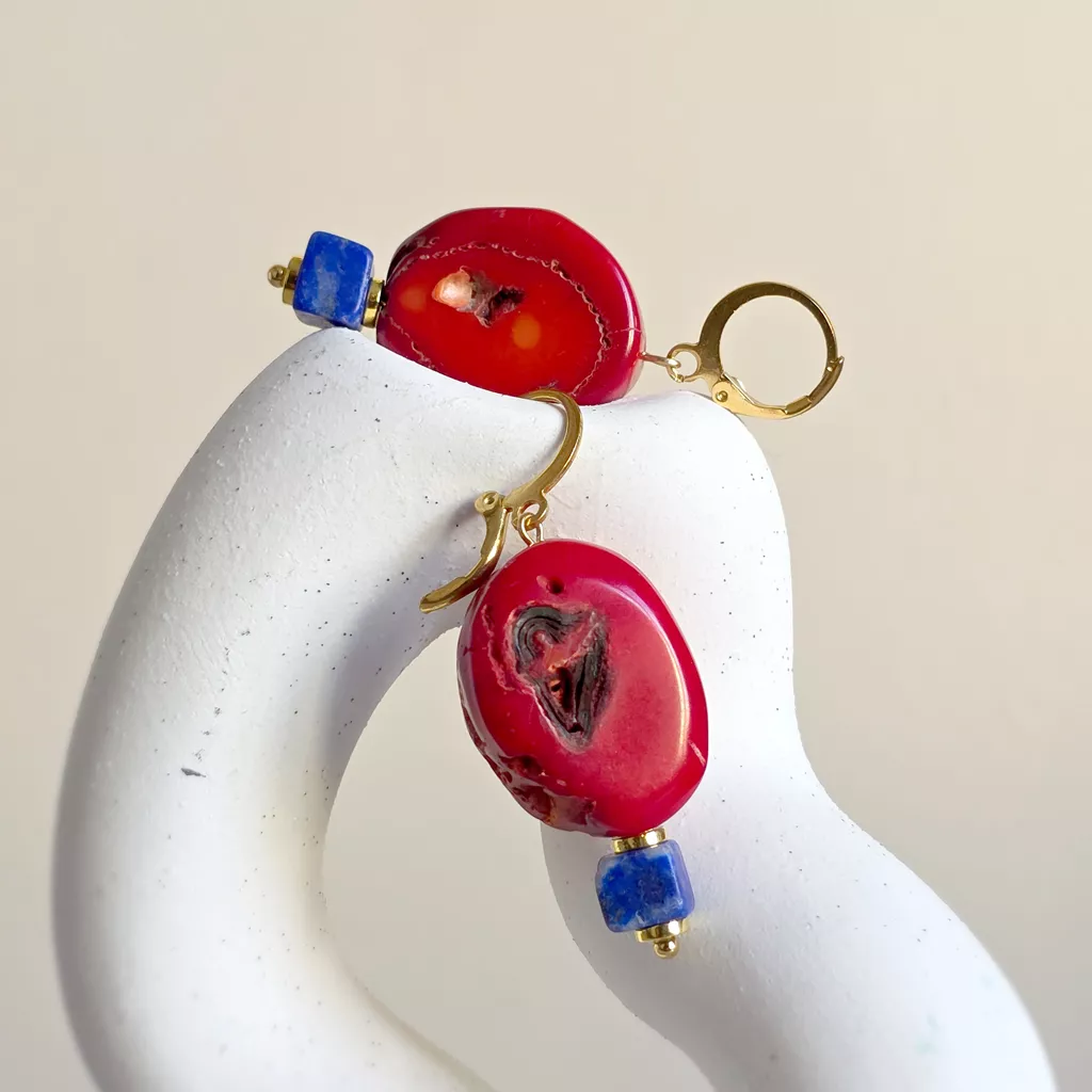 Kolczyki wiszące na złotej stali chirurgicznej łączą mocny kontrast barw z prostą, wyrazistą formą. Głównym elementem kompozycji są duże, owalne bryłki koralu w intensywnym odcieniu czerwieni, z naturalnym rysunkiem i nieregularnościami widocznymi na powierzchni. U dołu zawiesiłam niewielkie kostki lapis lazuli w głębokim, nasyconym niebieskim kolorze. Całość dopełniają drobne, złote przekładki z hematytu, które porządkują układ i podkreślają zestawienie czerwieni z kobaltem.