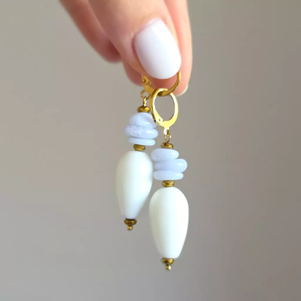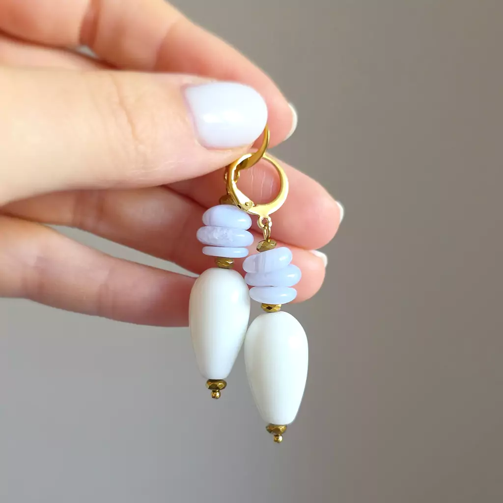 Kolczyki wiszące unikaty niebieski agat, biały agat, hematyt i złota stal chirurgiczna