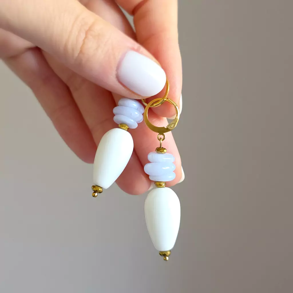 Kolczyki wykonane ręcznie z elementów metalowych ze stali chirurgicznej oraz kamieni naturalnych - agatu niebieskiego, agatu białego i hematytu.
