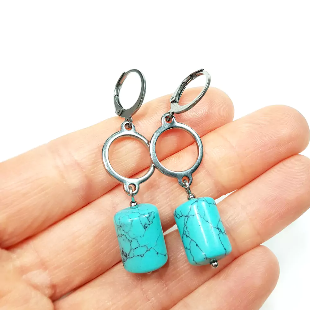 Kolczyki wykonane ręcznie z elementów metalowych ze stali chirurgicznej oraz baryłek barwionego na niebiesko magnezytu.