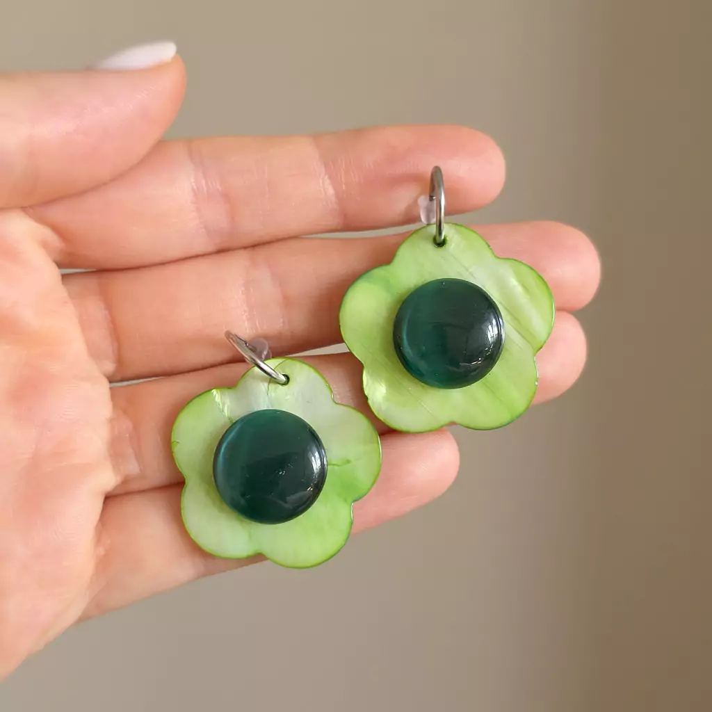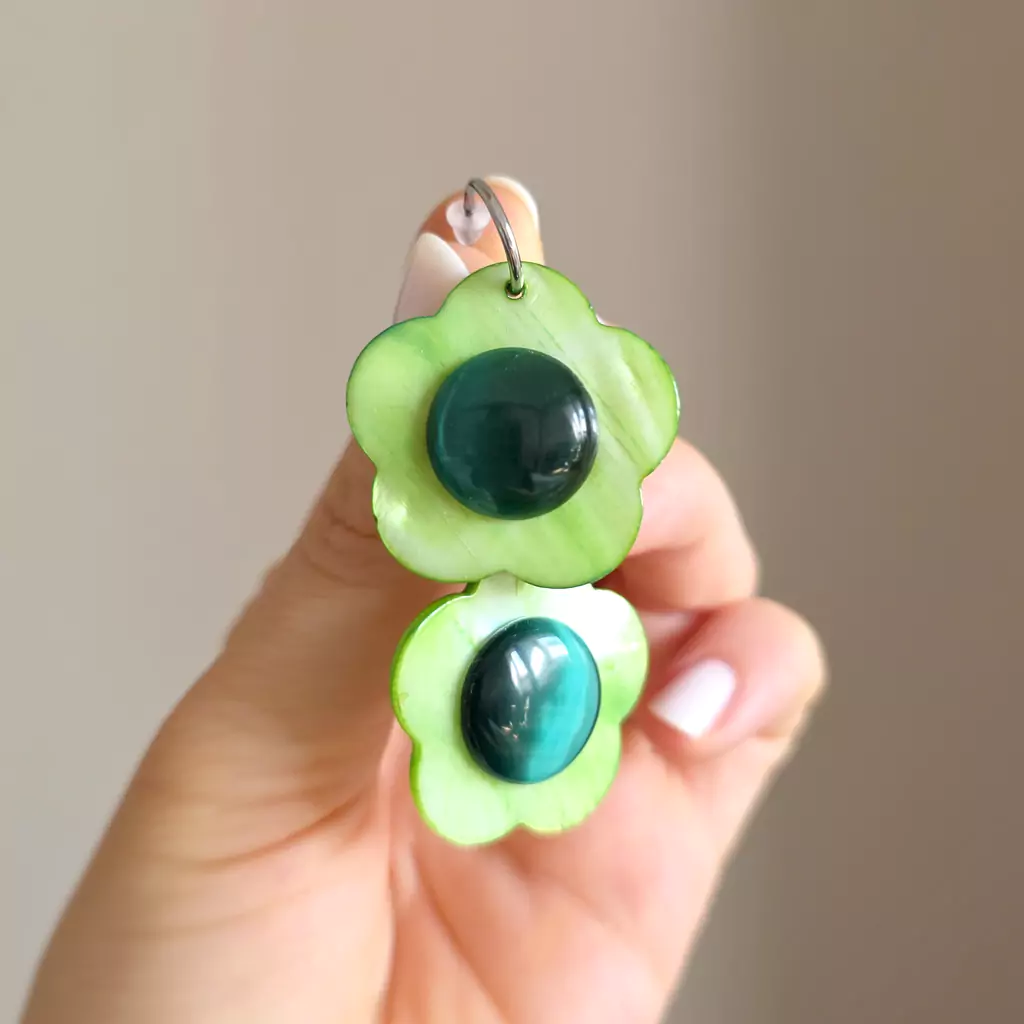Kolczyki wykonane ręcznie z elementów metalowych ze stali chirurgicznej oraz zielonych kwiatków z masy perłowej i zielonego kociego oka.