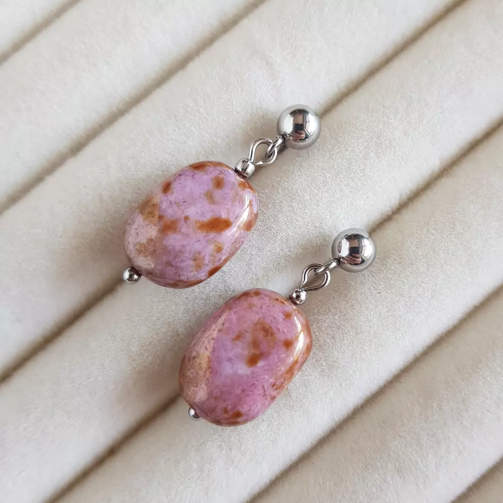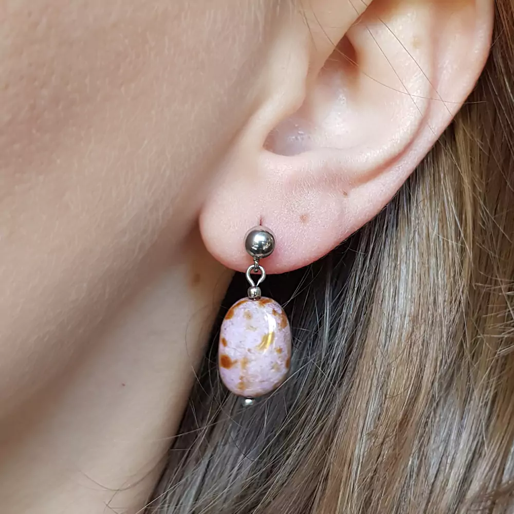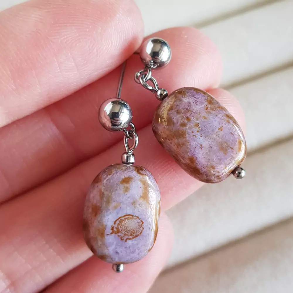 Kolczyki wykonane ręcznie z elementów metalowych ze stali chirurgicznej oraz szklanych pastylek.