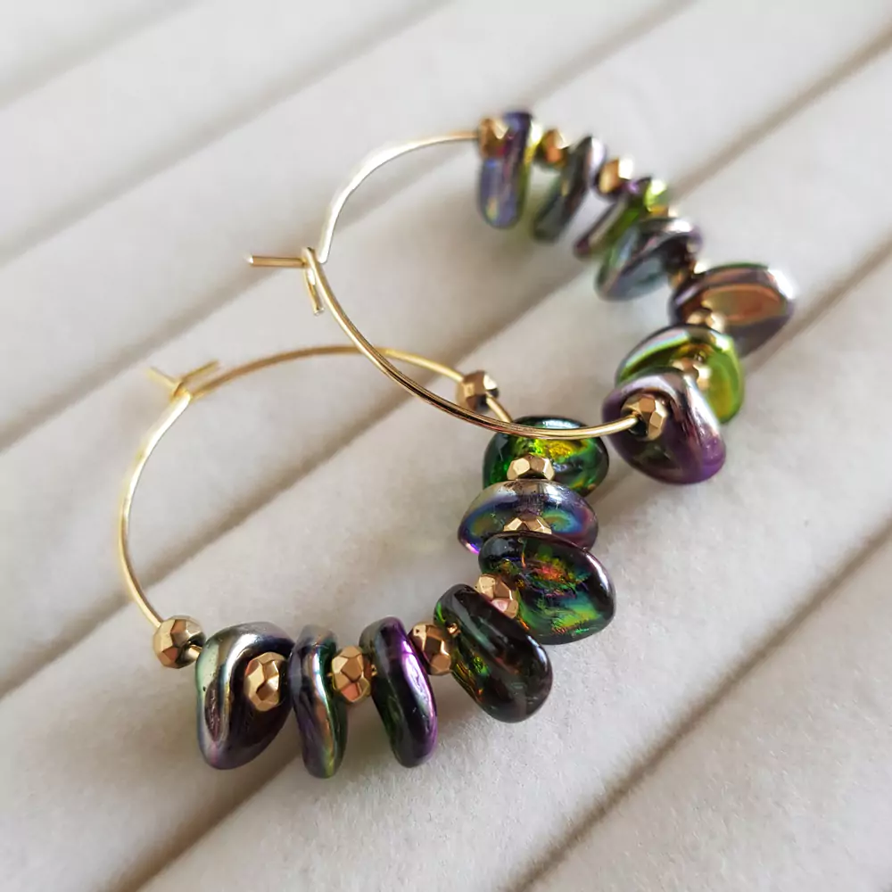 Kolczyki wykonane ręcznie z elementów metalowych ze stali chirurgicznej, oponek hematytu oraz szklanych płatków w odcieniach zieleni i fioletu.