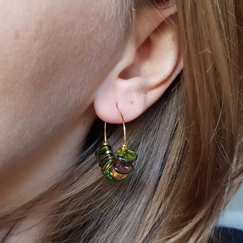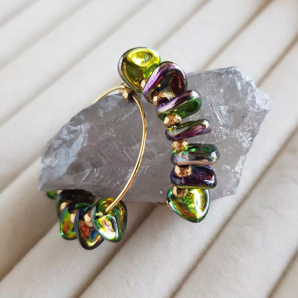 Verre kolczyki wiszące szklane płatki i hematyt na kółeczkach złota stal chirurgiczna v.2