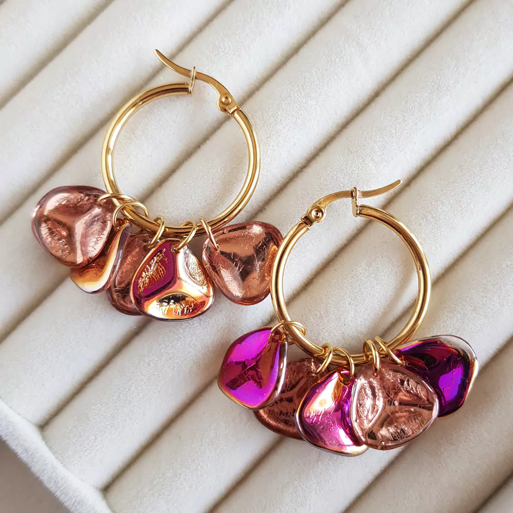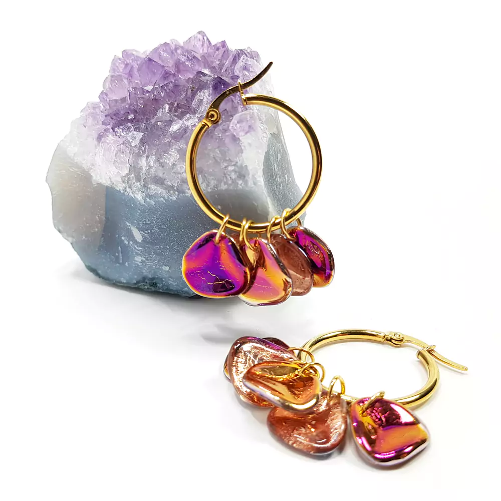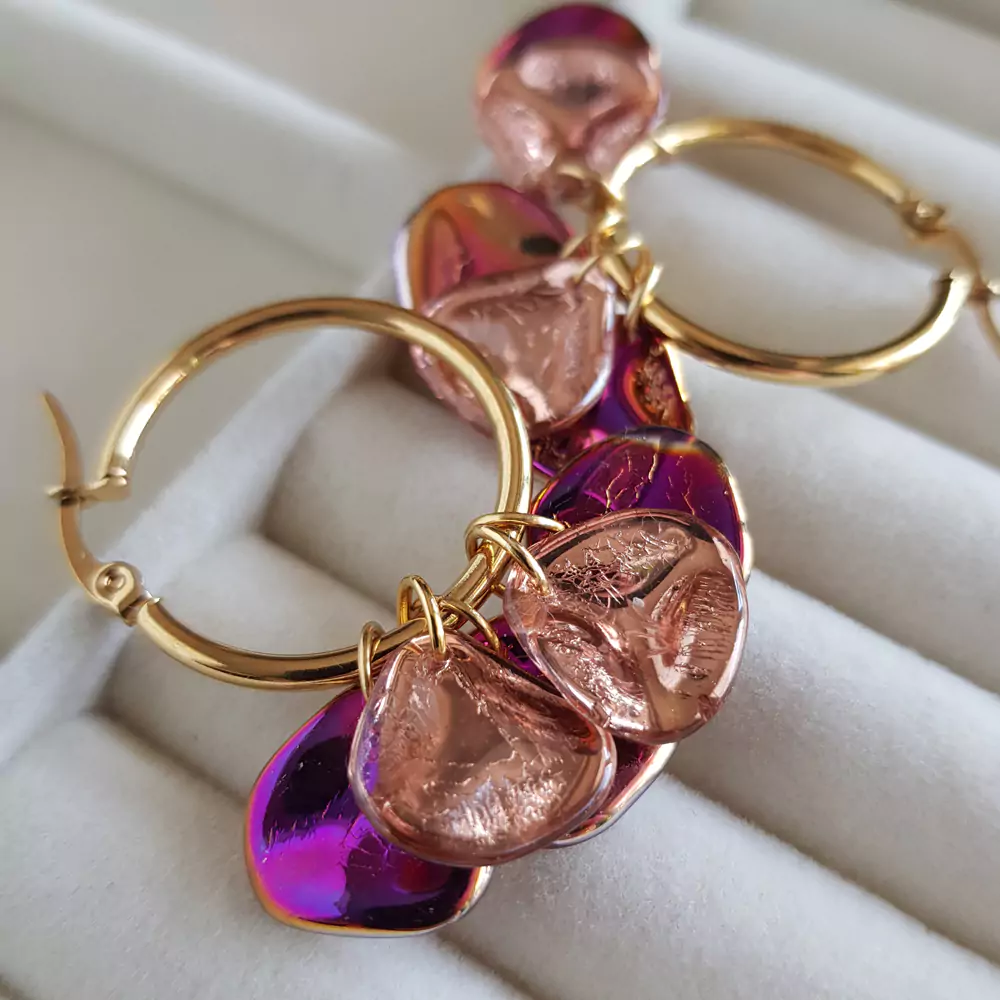 Verre kolczyki wiszące szklane płatki na złotych kółeczkach stal chirurgiczna